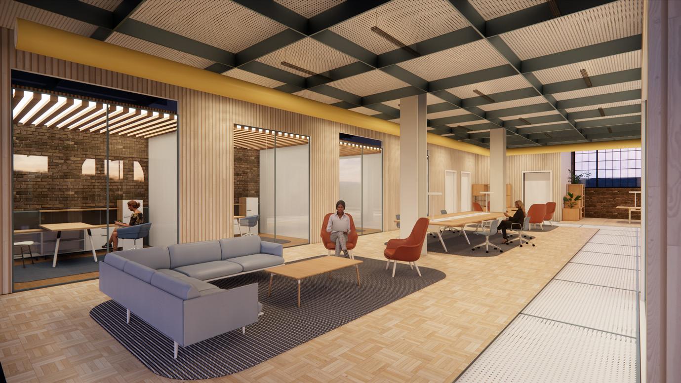 The spaces are viewed as building blocks stacked vertically creating the mezzanine levels and providing space for private offices, breakout spaces, and lounge areas with collaborative workspace filling in the spaces between on the blocks.