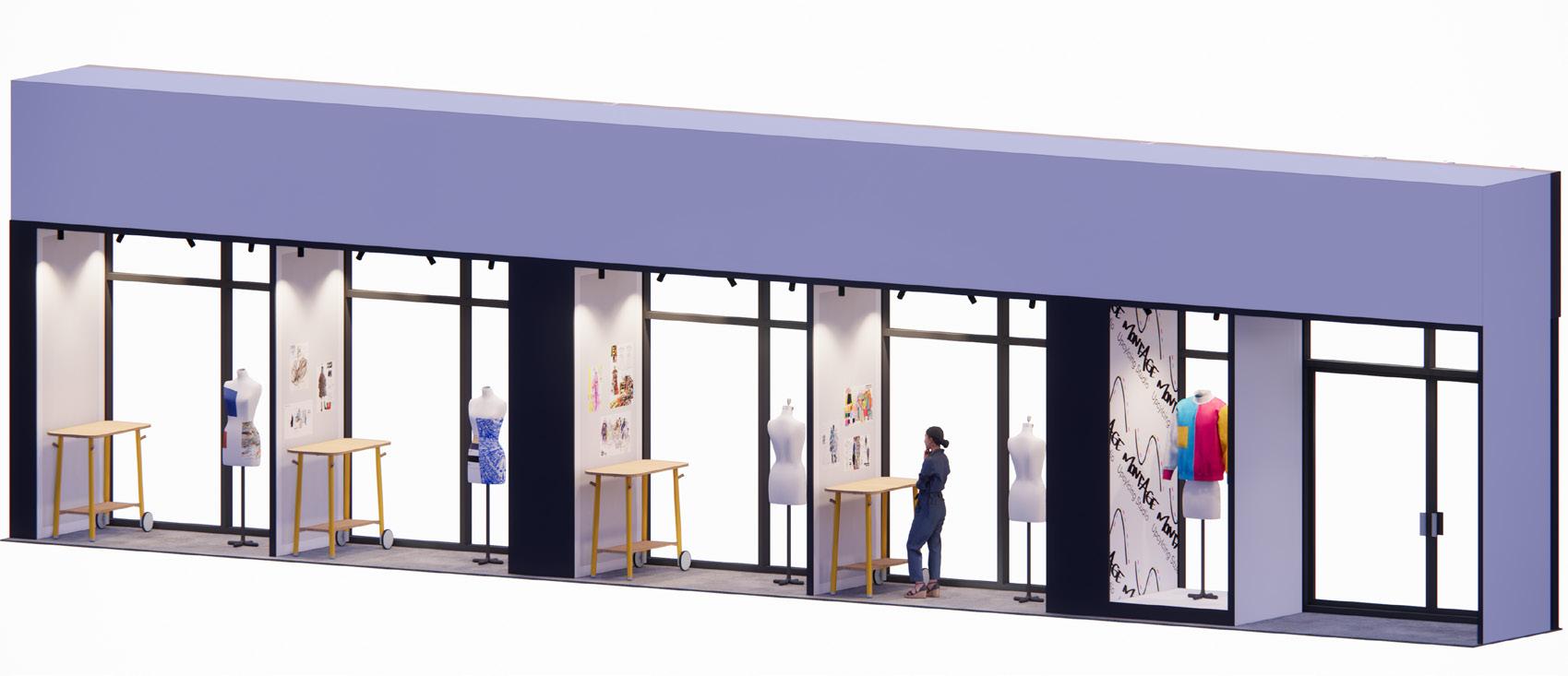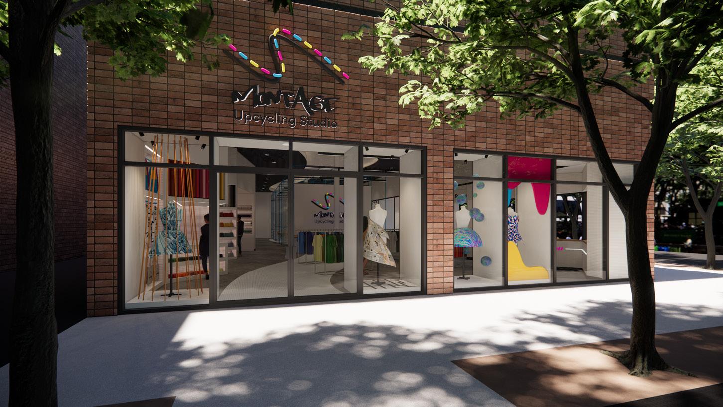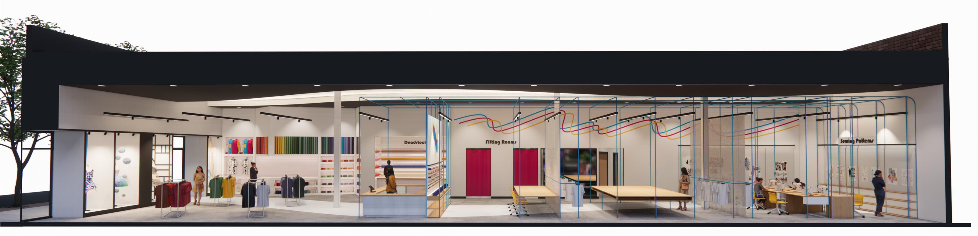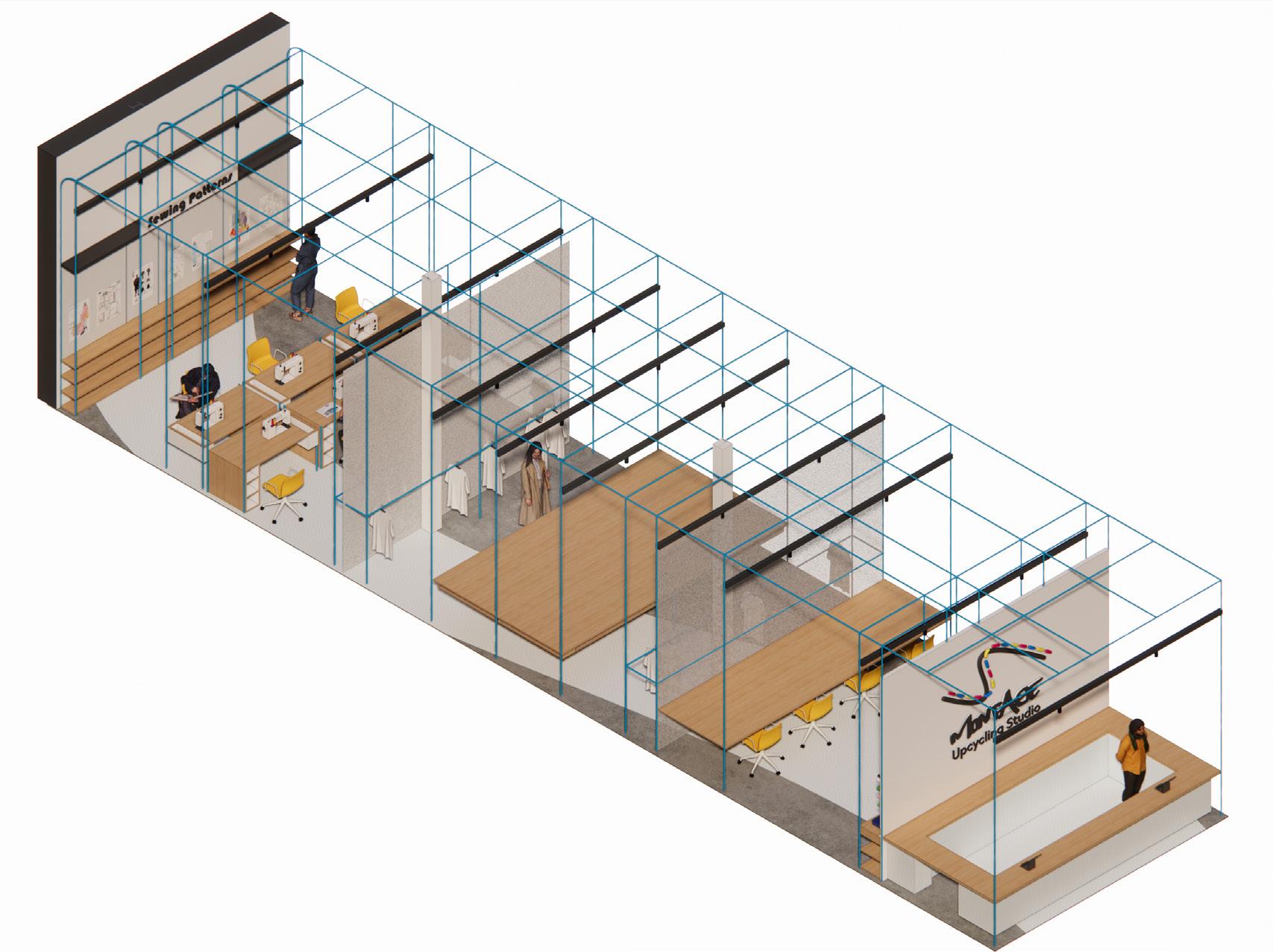 The design features window display booths demonstrating the possibilities of the craft by featuring artistic works created through upcycling. In order to emphasize the clothing as artwork, the space uses a minimal material palate as a blank canvas. A main feature of the space is the scaffolding element supporting the workspace, reflecting the opportunity to create something new using what exists as a framework.