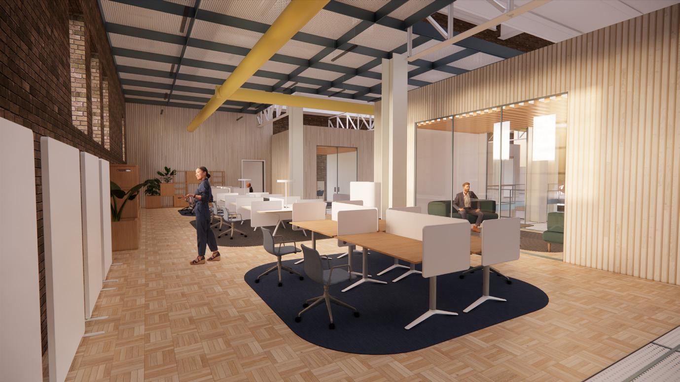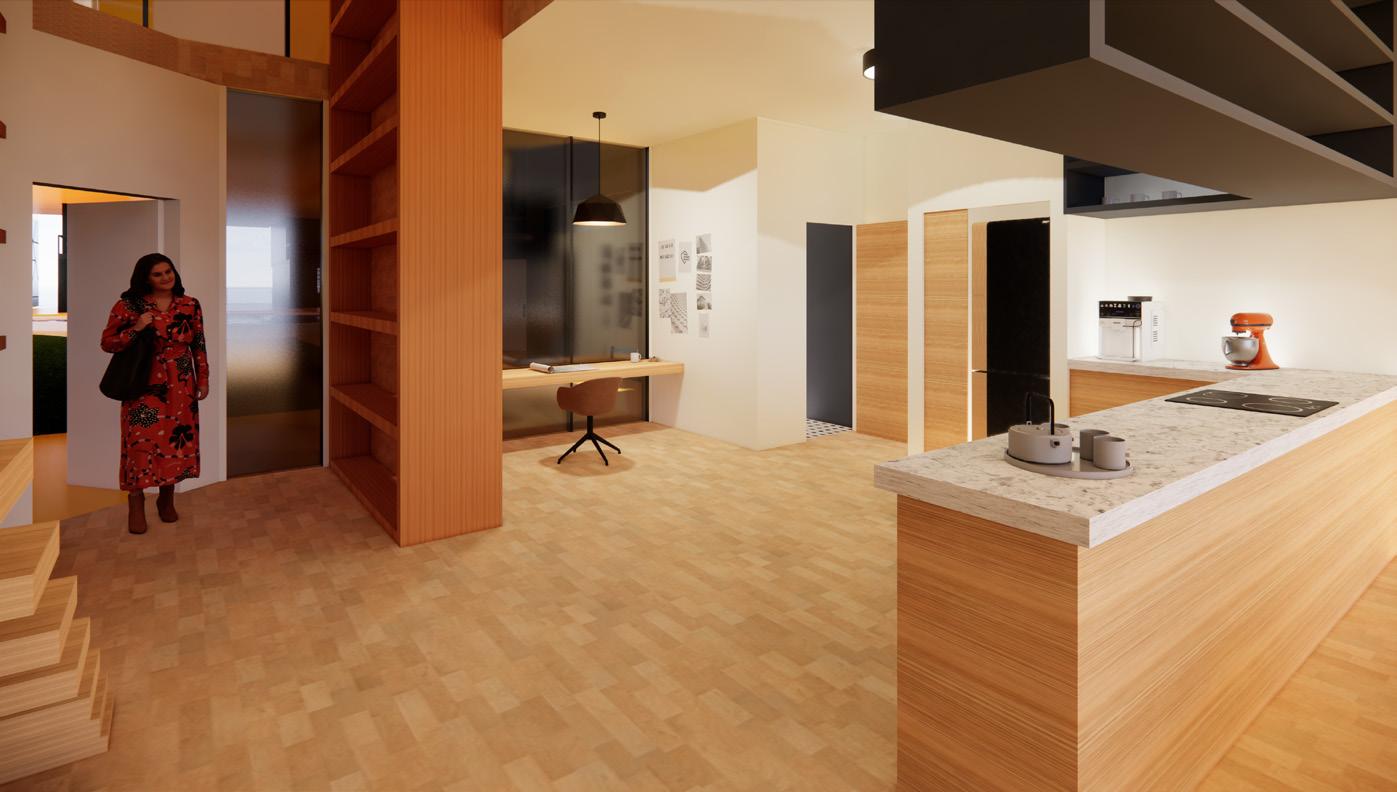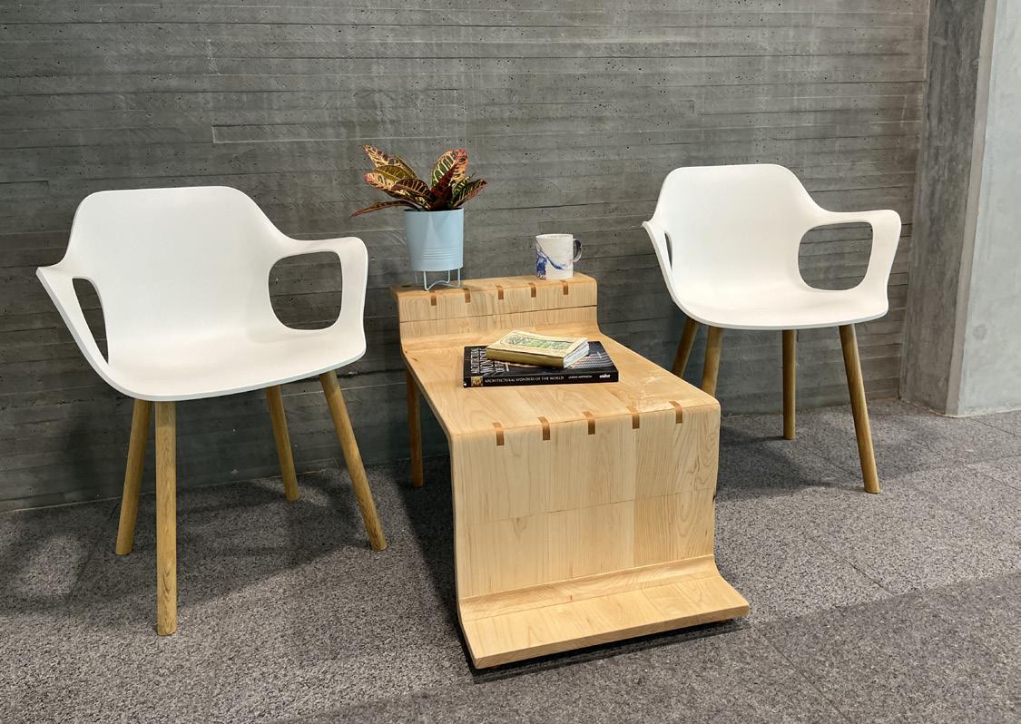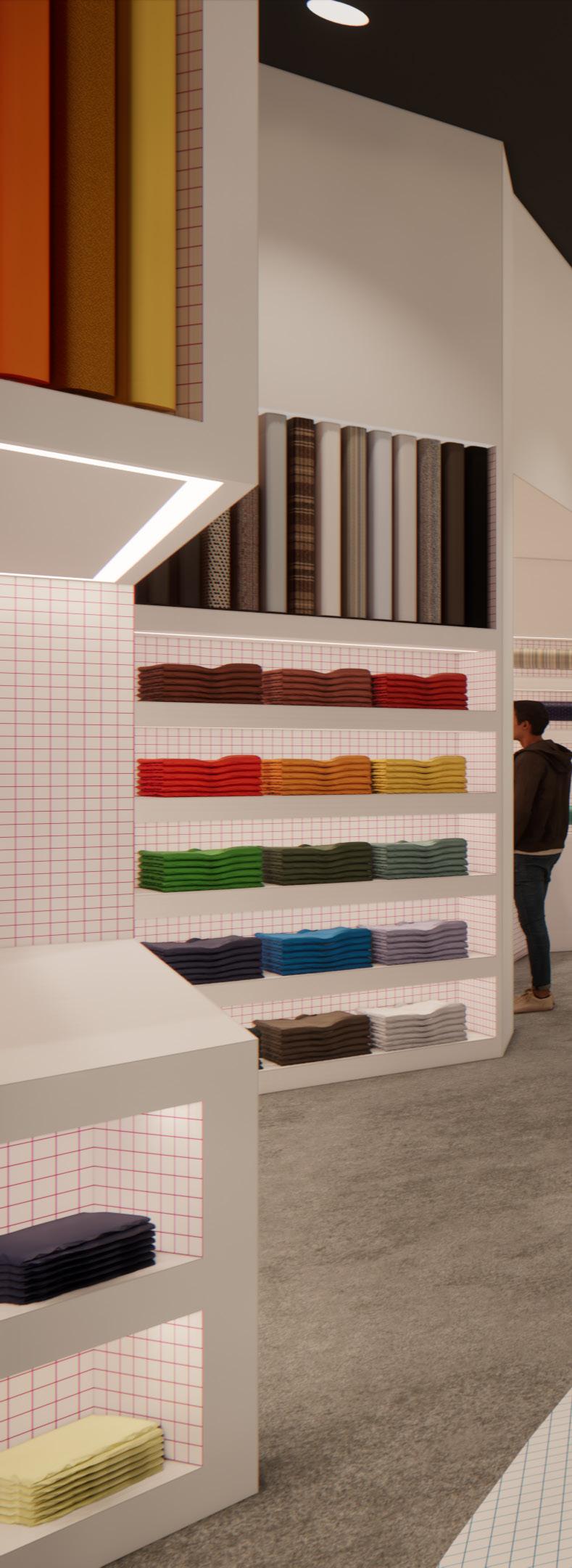 The design features window display booths demonstrating the possibilities of the craft by featuring artistic works created through upcycling. In order to emphasize the clothing as artwork, the space uses a minimal material palate as a blank canvas. A main feature of the space is the scaffolding element supporting the workspace, reflecting the opportunity to create something new using what exists as a framework.