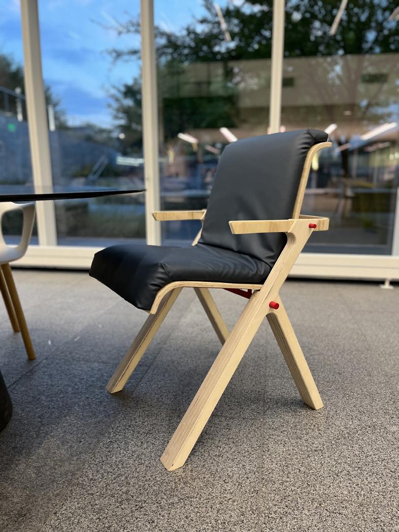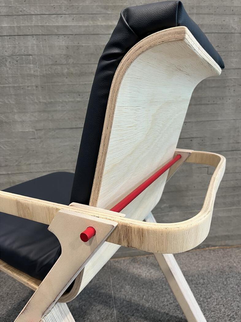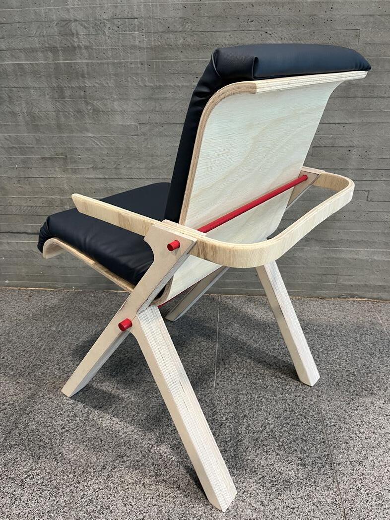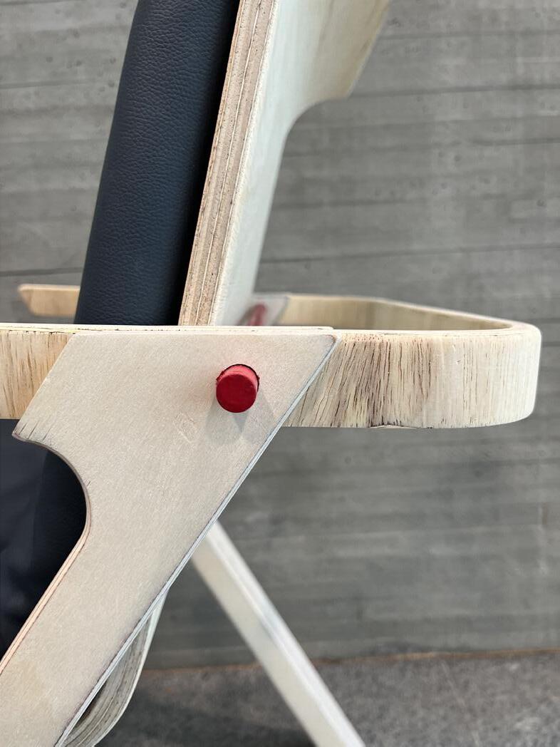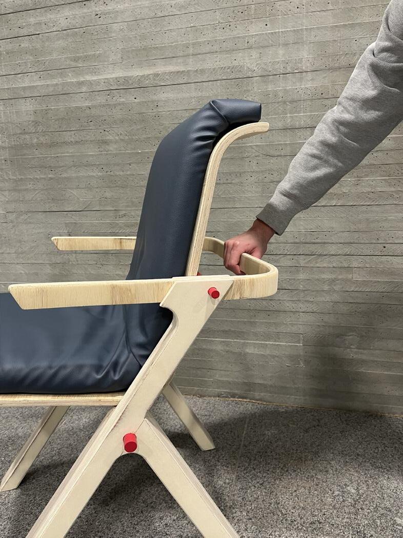 The seat is embraced by a vacuum formed arm piece that wraps around the chair and nestles into two angular legs. The legs are made up of a series of pieces cut by the CNC and layered together to promote strength at the seats weak points. A curved, metal cantilever structure supports the seat and brings a pop of color into the design that pairs well with the blue of the leather upholstery.