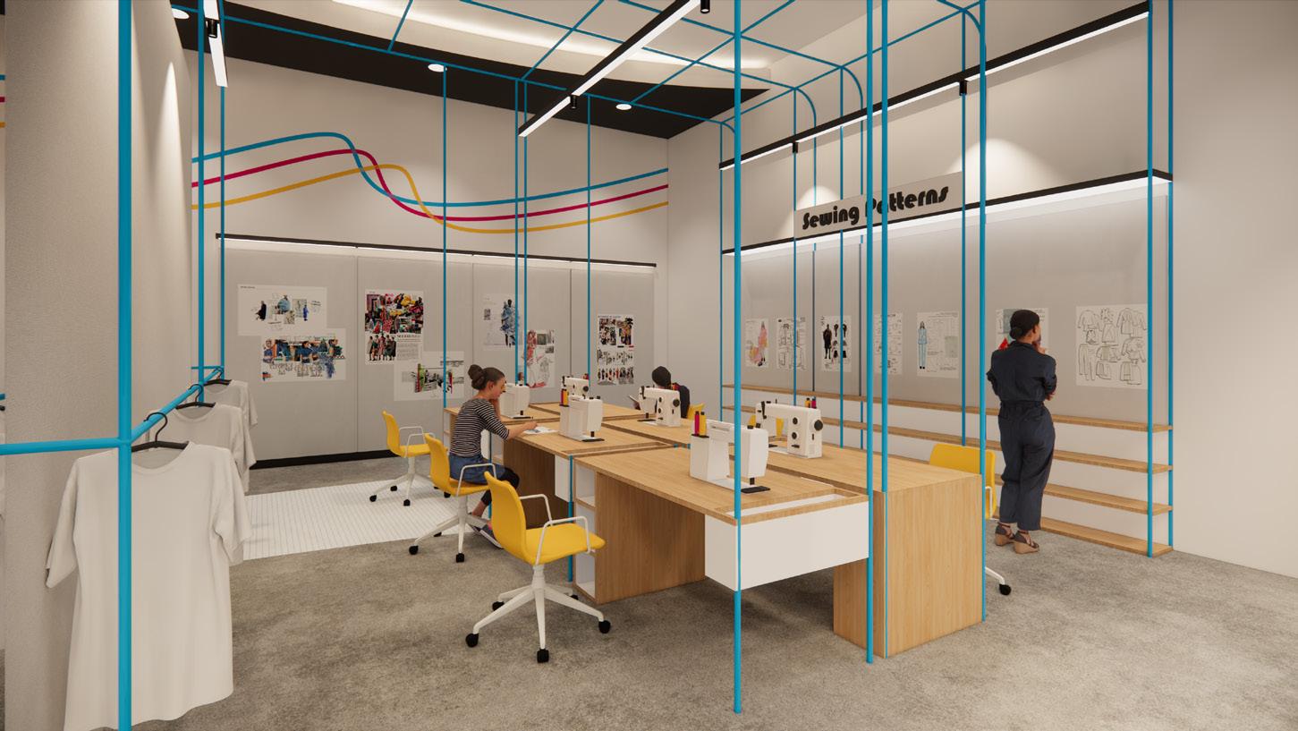 The space is divided into two main areas. Customers enter into retail space to thrift for old clothing, fabric waste, and brand merchandise. Second is the up-cycling workshop, featuring ideation space, pin up booths, cutting tables, sewing machines, and resource storage.