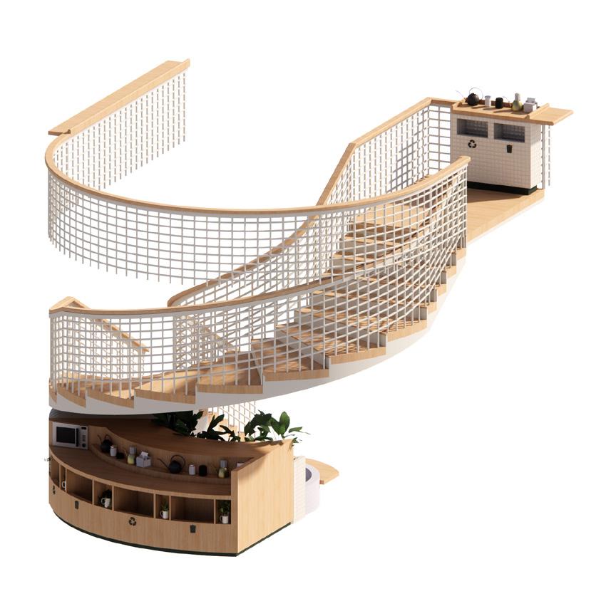 The stair to the mezzanine wraps around the garden, enveloping it and creating a sense of reveal as users of the space pass around and up it.