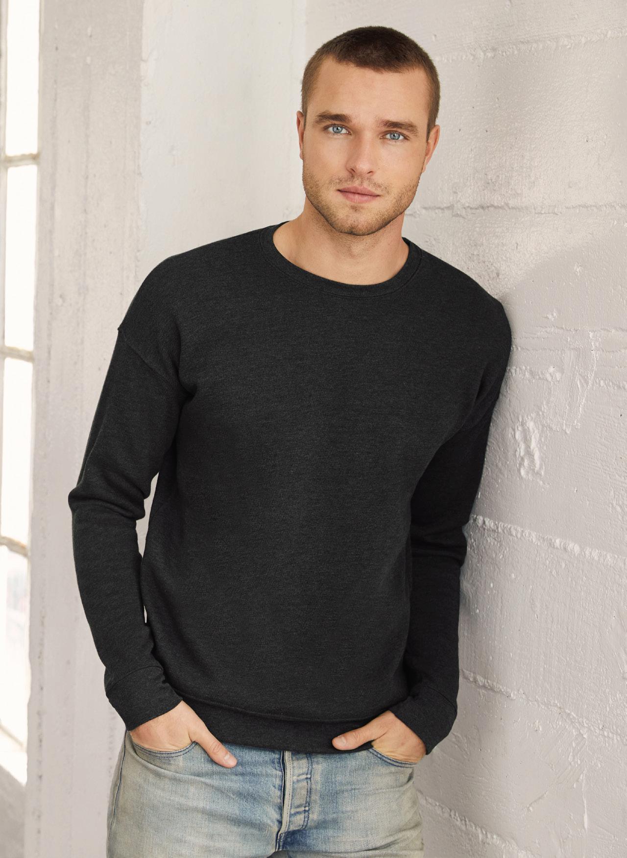 Soft cotton faced fabric. Brushed back fleece. Drop shoulder style. Fashion fit. Ribbed collar, cuffs and hem. Taped neck. Twin needle stitching.