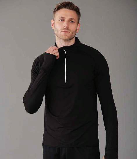 Raglan sleeves with flatlock stitching. 1/4 length zip with chin guard and reflective trim. Reflective detail on back of shoulder seams. Concealed zip key pocket on left back panel seam, with inner headphone access. Side panels. Elasticated bound cuffs and hem. Thumbholes and fold over cuffs.