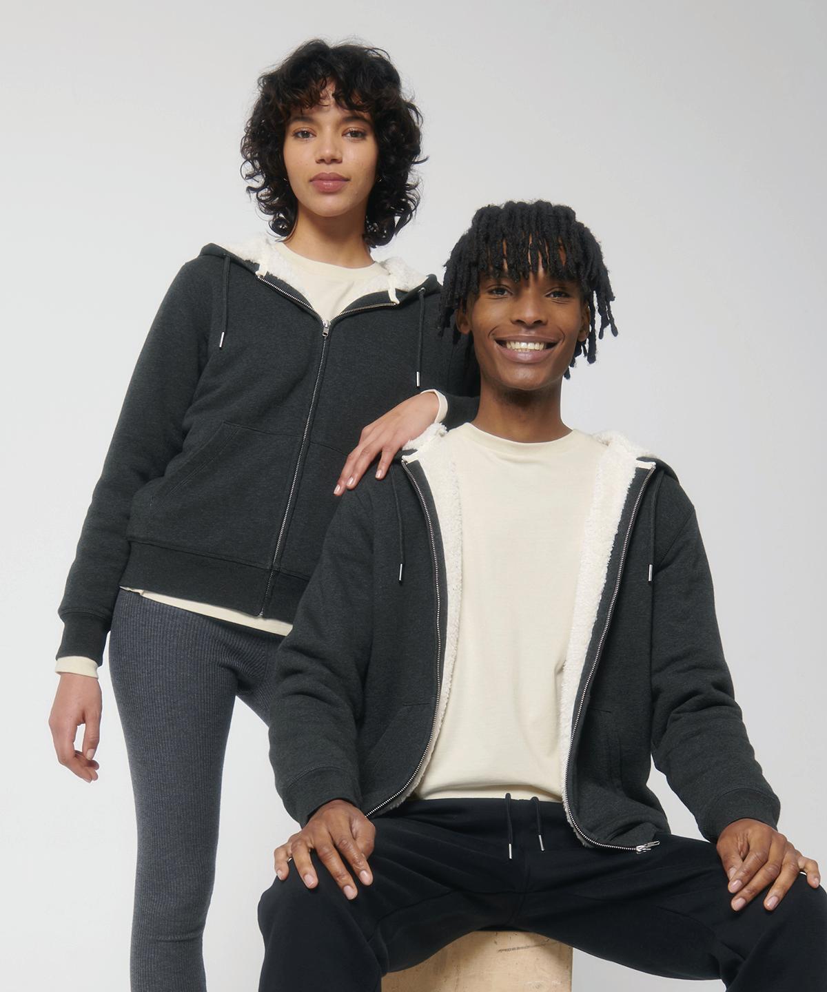 The medium fit unisex sherpa lined zip-through hoodie sweatshirt features a lined hood in recycled sherpa, and has round drawcords in matching body colour with metal tipping. Inside invisible zip at bottom hem for easy decoration. Lined hood in recycled sherpa. Round drawcords in matching body colour with metal tipping. Metal eyelets. Inside herringbone back neck tape in greige colour. Kangaroo pocket at front. Fully lined with recycled sherpa inside chest pocket. EKO-TEX® certified. Fairwear certified. Global Recycled Standard certified. Vegan certified.