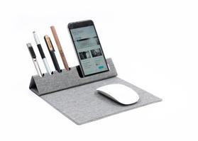 Made from RPET, this multi-function portable desktop tool is a Mouse Pad, Phone Holder and Pen Holder.