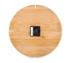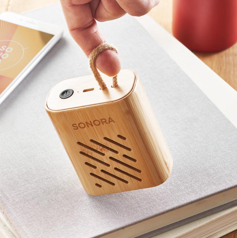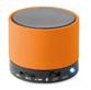 4.2 wireless speaker in ABS with bamboo casing. 1 rechargeable Lion 450 mAh battery and light at the bottom of the speaker. Output data: 3W, 4 Ohm and 5V. Micro USB cable included. Playing time aprox. 3h. Size Ø7x4,3 cm Print technique Pad printing*,L,DO1