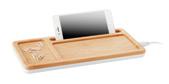 5.0 wireless speaker in Bamboo and 10W wireless charger. Connect device to your computer, place smartphone on it to commence charging. 1 Rechargeable Li-Ion 2000 mAh battery. Output data: 3W, 4 Ohm. Playing time approx. 4h.