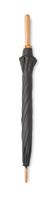 3 fold, 21 inch (dia. 95cm) umbrella with wooden handle. Black plated shaft, fiberglass ribs. Automatic opening and closure. Including a matching pouch.