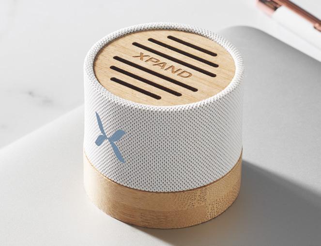 5.0 wireless speaker in RPET casing with bamboo detail on top. 1 Rechargeable Li-ION 300 mAh battery included. Includes an SD card port and an AUX/ USB cable. Output data: 3W, 3 Ohm and 5V. Playing time approx. 3h. Size Ø6,1x5,3 cm Print technique Round screen printing ,L,P