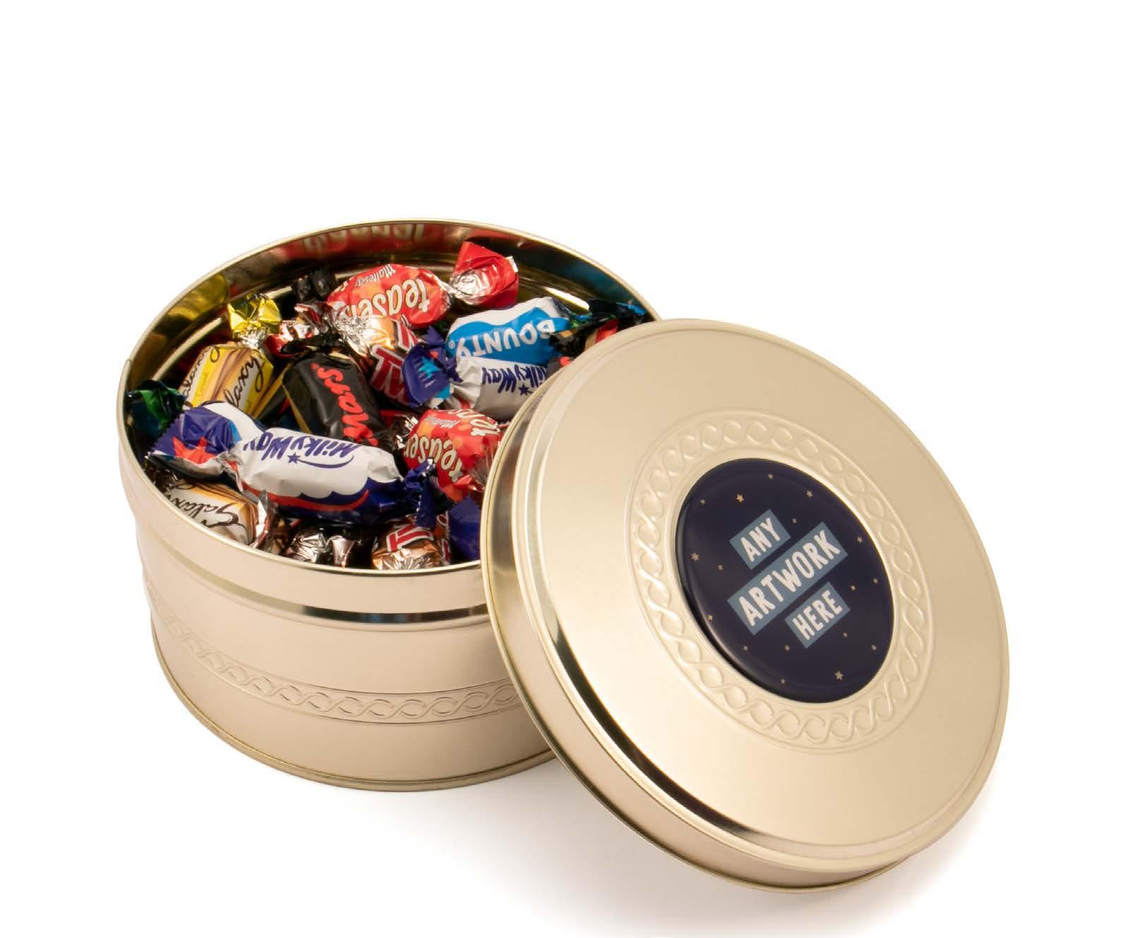 FULL COLOUR DOME LABEL 157 x 85mm FILLING OPTIONS: - Celebrations - Shortbread - Quality Street Our gold treat