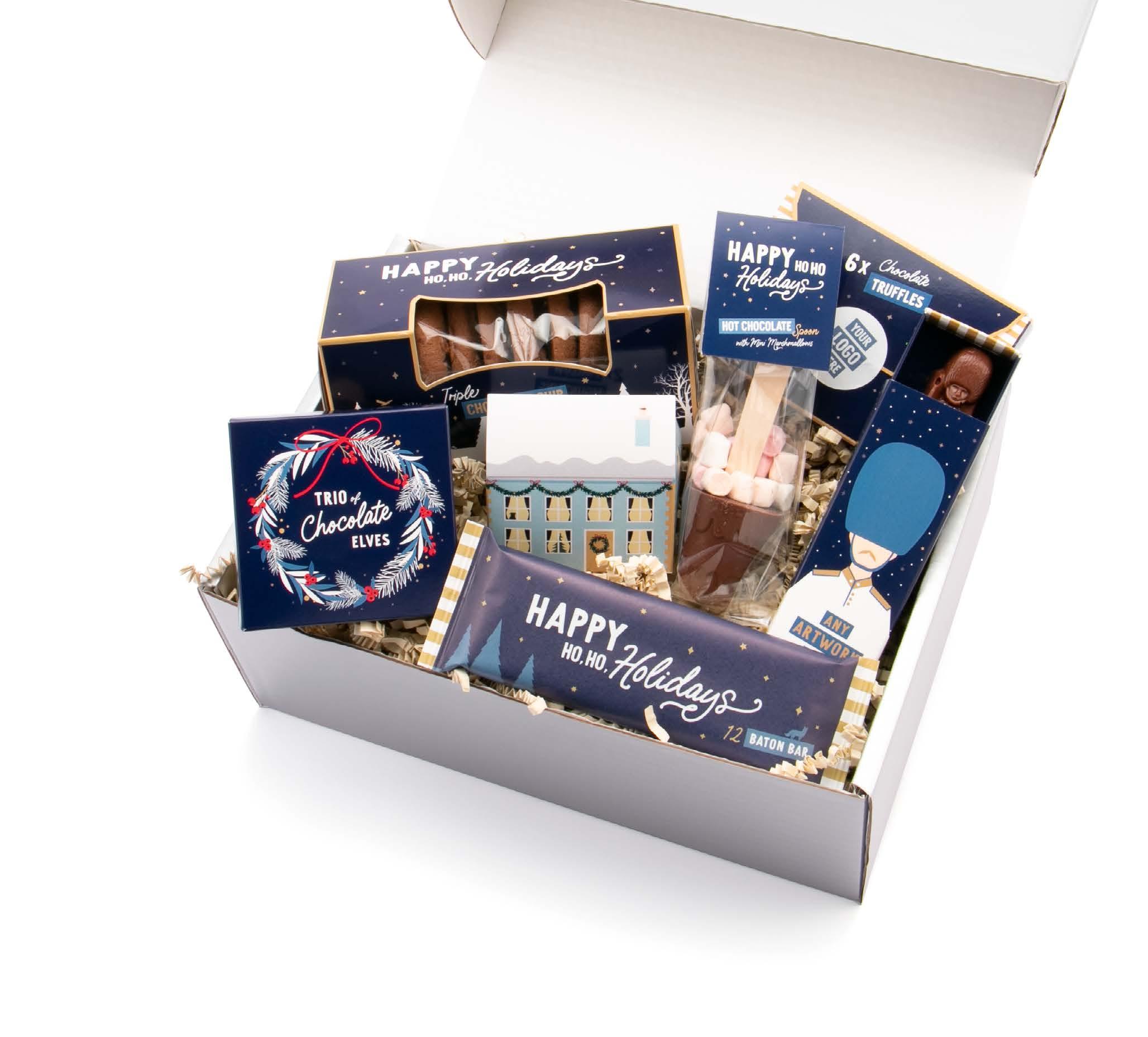 26 UK MADE FULL COLOUR BOX LABEL INCLUDES: - Treat Box 3x Chocolate Elves - Eco Biscuit Box Choc-Chip Biscuits - Eco House Box 2x Mallow Mountains - Info Card Hot Choc Spoon - Luxury 6 Choc Box Chocolate Truffles - 12 Baton Bar Milk Chocolate - Eco Match Box Milk Chocolate Soldier We’ve got your seasonal gifting all wrapped up this winter with our Santastic silver gift box in MAXI size! We can customise the contents and the box for the perfect, personalised pressie.