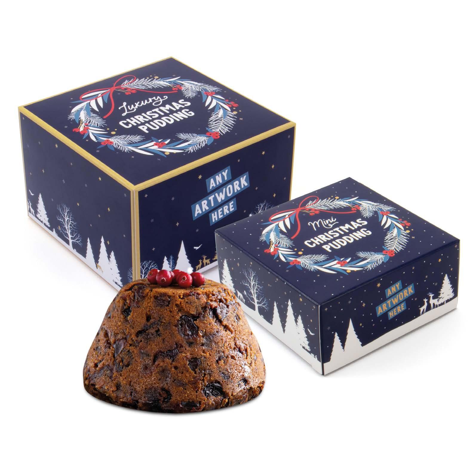 UK MADE FULL COLOUR PRINT Mini 85 x 85 x 45mm Maxi 95 x 95 x 64mm MAXI CHRISTMAS PUDDING MINI VEGAN CHRISTMAS PUDDING These rich and fruity chrimbo classics comes perfectly wrapped in our eco maxi and mini pudding box. It’s fully recyclable, deliciously different and will put everyone in the seasonal spirit.