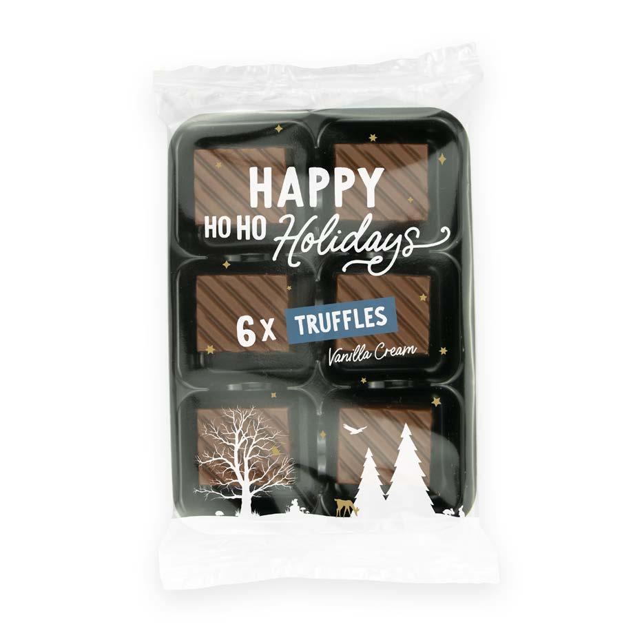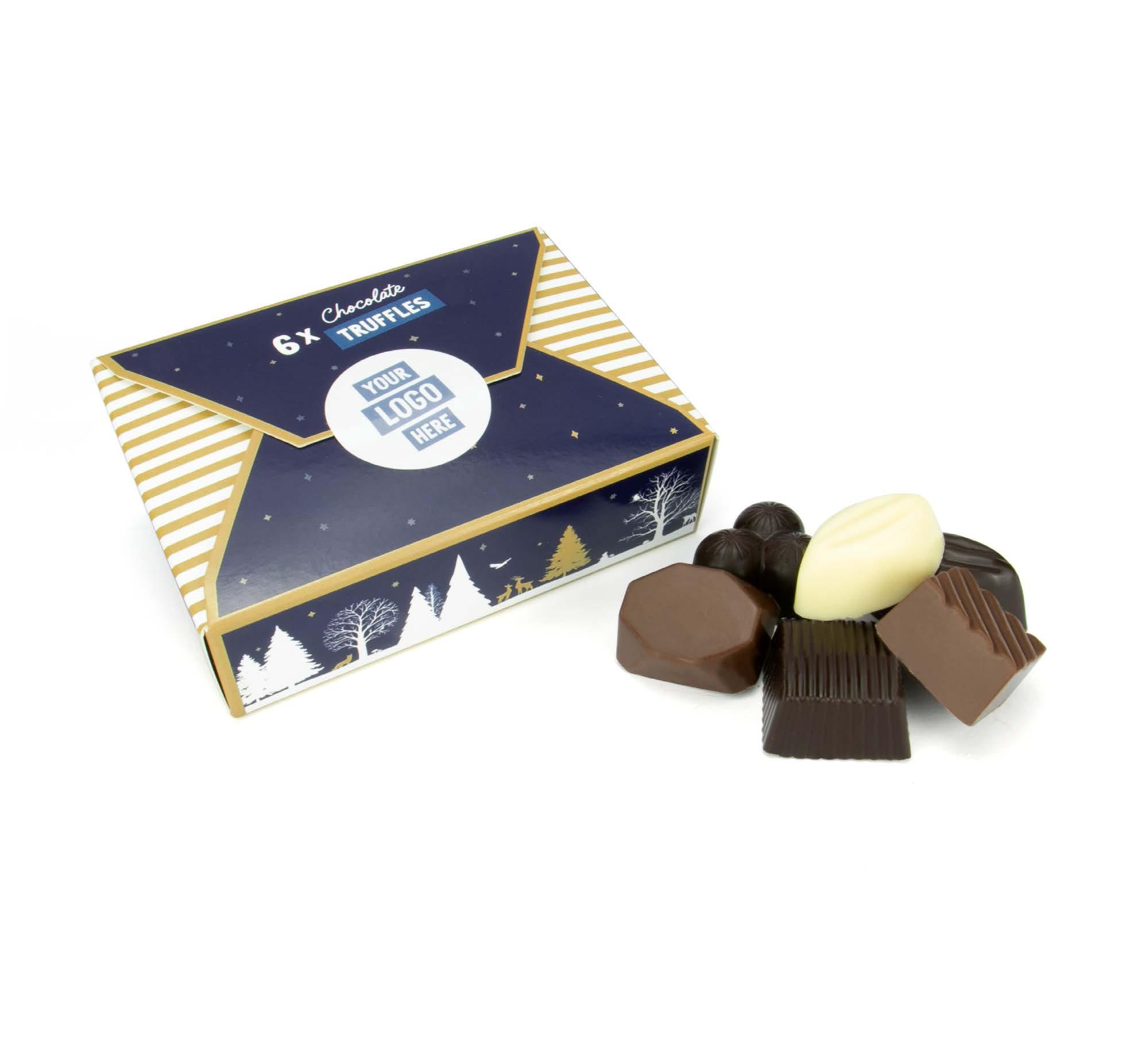 UK MADE FULL COLOUR PRINT 112 x 82 x 32mm X6 CHOCOLATE TRUFFLES - White, 41% milk and 71% dark chocolate selection - Six different fillings - Sustainably sourced chocolate Tantalise your taste buds with our luxury seasonal stocking-filler. This fully recyclable chocolate gift box is filled with six smooth, cocoa-rich truffles in all the flavours of the festive season. 15