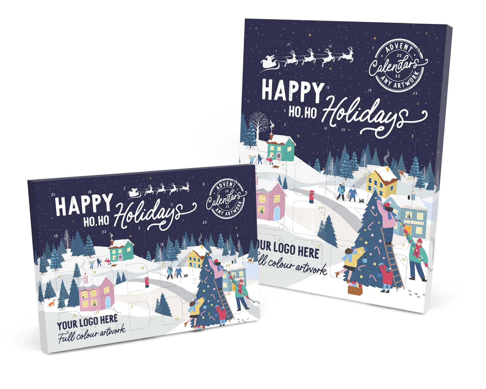FULL COLOUR PRINT Mini 210 x 148 x 15mm Maxi 215 x 282 x 14mm FILLING OPTIONS: - 41% Milk Chocolate - 71% Dark Chocolate - 3D moulded chocolates with your logo or image Make the ho-ho-holidays a happy one with a letterbox eco Advent calendars decorated from edge to edge with your own festive messages and any artwork. A delicious chocolate (made by our very own UK-based elves) sits behind each of the 24 window.