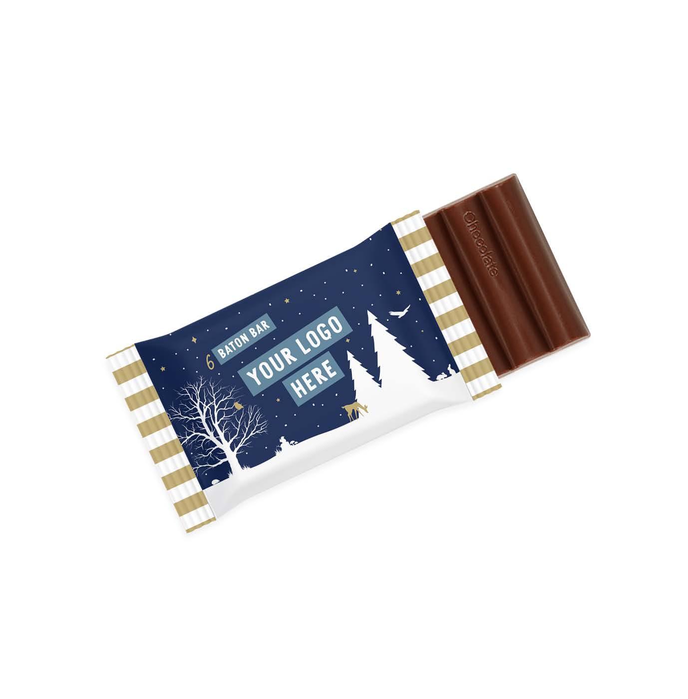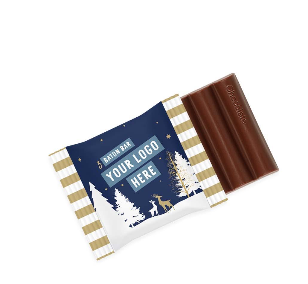 FULL COLOUR PRINT TO KRAFT WRAP 3 Baton: 50 x 35 x 10mm 6 Baton: 108 x 50 x 10mm 12 Baton: 180 x 50 x 10mm OPTIONS - 41% Milk Chocolate - 71% Dark Vegan Chocolate Our