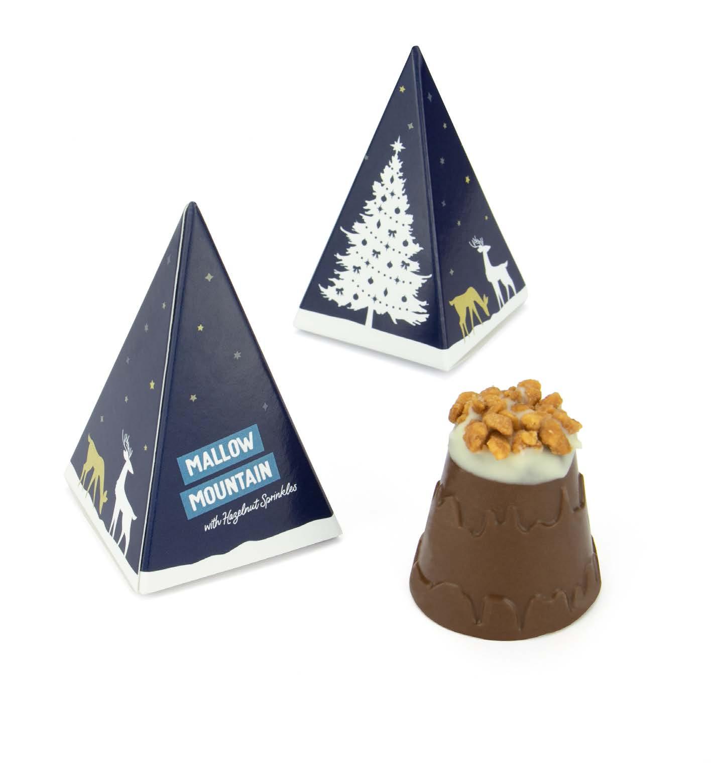 UK MADE FULL COLOUR PRINT 138 x 51 x 45mm X3 MALLOW MOUNTAINS - 41% Milk Chocolate - Mallow Filling - White Chocolate topping with hazelnut sprinkles To summit all up – three creamy chocolate mountains packed full of fluffy mallow and sprinkled with hazelnuts for a delicious festive treat. 6
