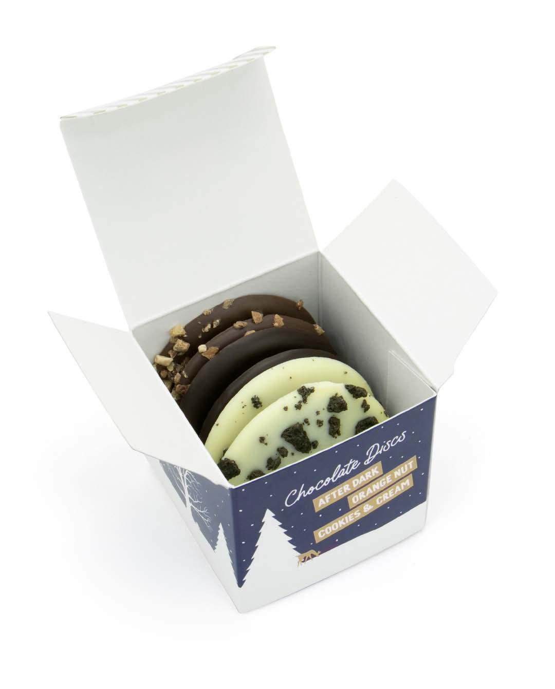 UK MADE FULL COLOUR PRINT 50 x 50 x 50mm X6 CHOCOLATE DISCS - White, 41% milk and 71% dark chocolate selection - Three different fillings - Sustainably sourced chocolate Choc out our new festive eco maxi cube filled with six delicious seasonal chocolates. Made in-house at our UK sweet factory using the finest cocoa beans and flavours, there’s a choc-a-lot to love about this gift. 7