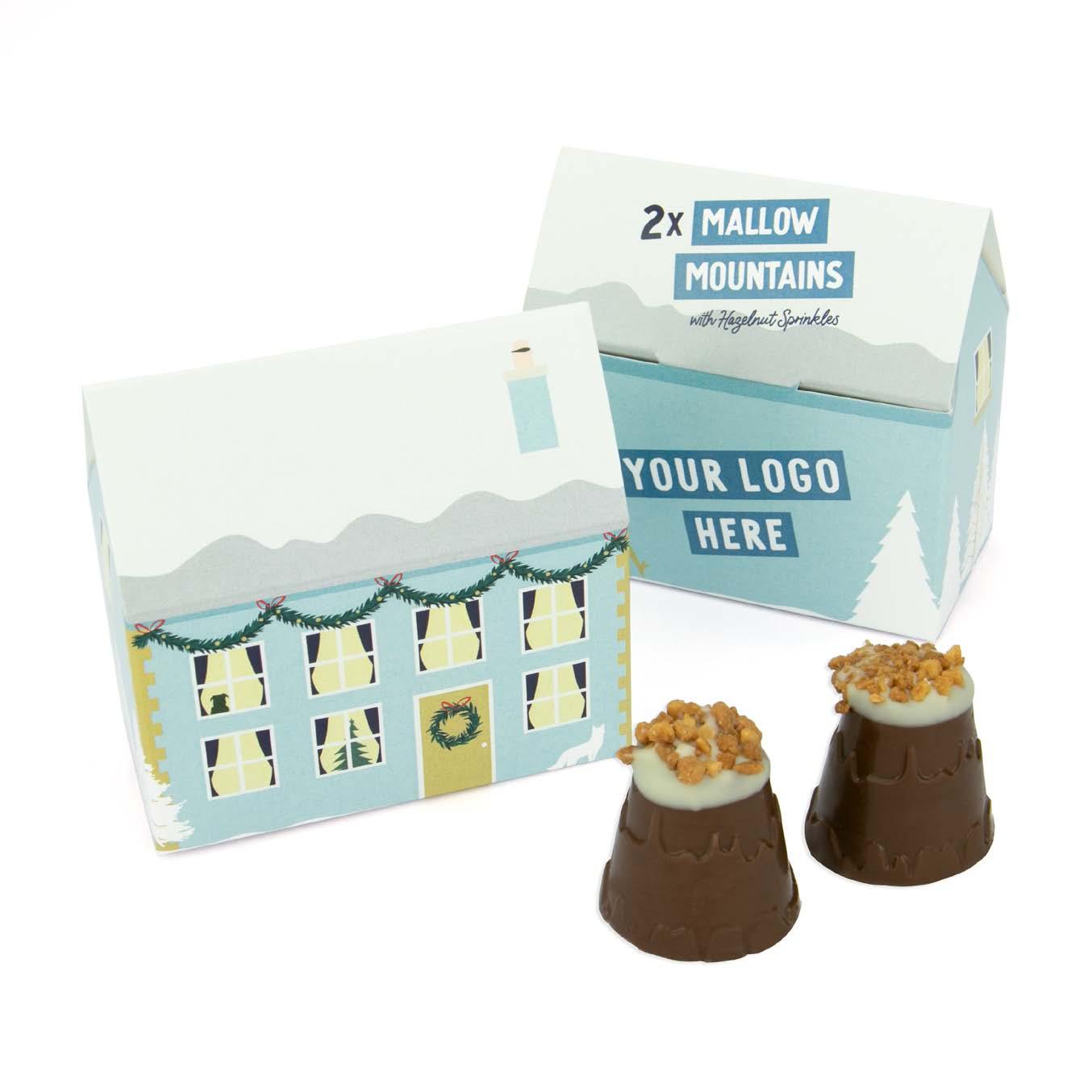your blessings this festive season with these delightful little houses containing two snow-capped chocolate mountains. Filled with soft-as-snow mallow and topped with crunchy hazelnut