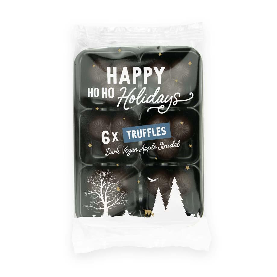 FULL COLOUR FLOW WRAP 80 x 140 x 30mm X6 CHOCOLATE TRUFFLES - Choose between white, 41% milk and 71% dark chocolate - Three different fillings choices - Vegan option available Six sensational truffles beautifully presented in our flow wrapped tray, which can be personalised with your logo and message in full colour digital print. UK MADE 14 WHITE RASPBERRY DARK VEGAN APPLE STRUDEL VANILLA CREAM