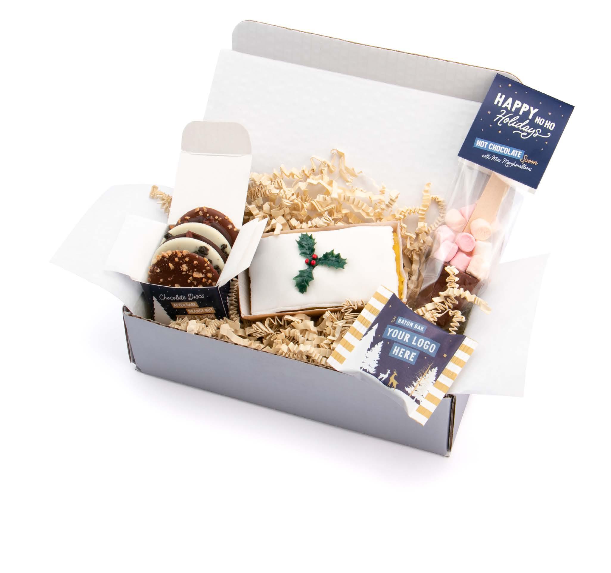 UK MADE FULL COLOUR BOX LABEL INCLUDES: - 3 Baton Bar Milk Chocolate - Info Card Hot Choc Spoon - Eco Mega Cube Chocolate Discs - Iced Christmas Cake*