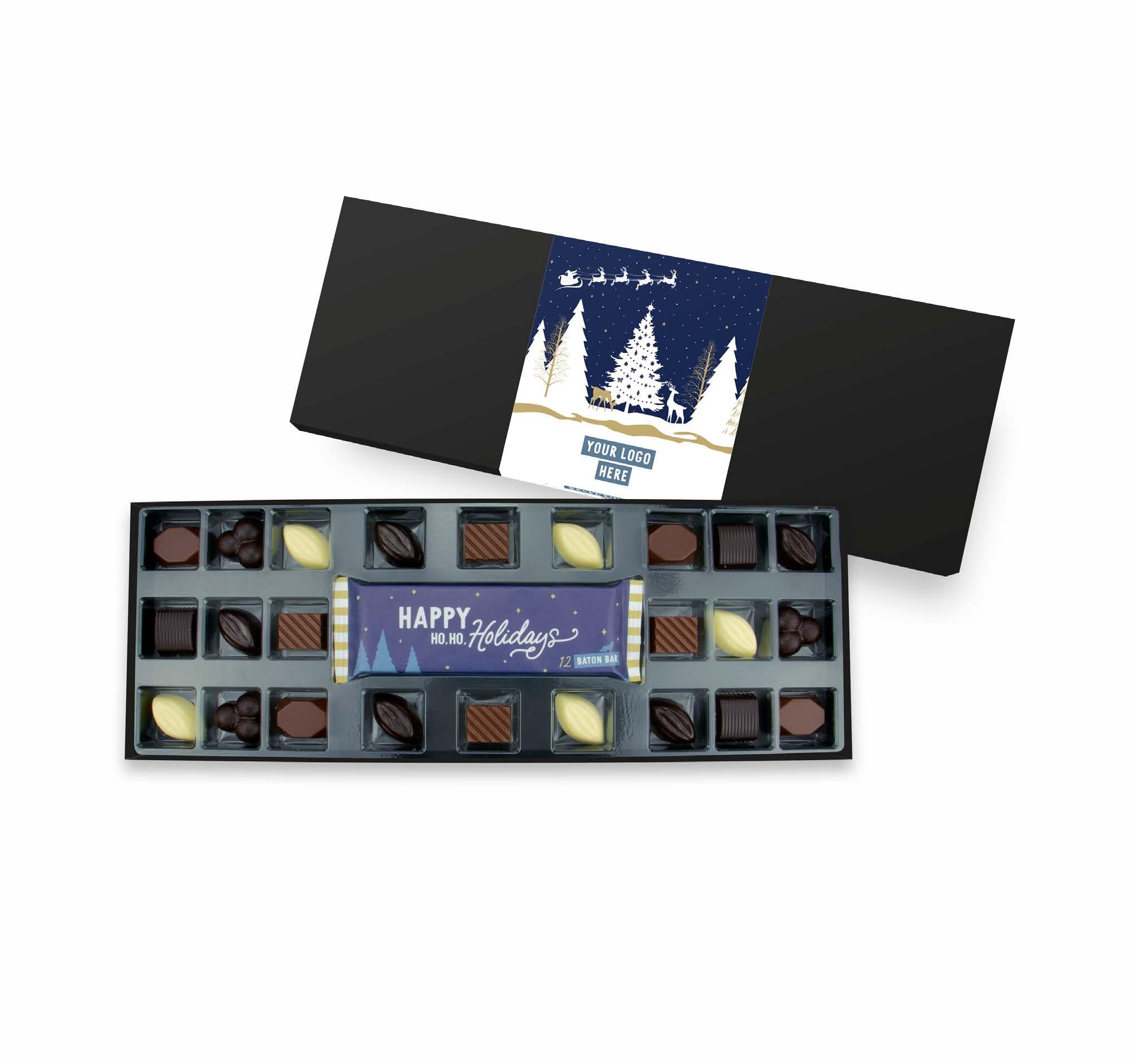UK MADE FULL COLOUR PRINTED CARD WRAP 410 x 145 x 32mm X24 CHOCOLATE TRUFFLES 12 BATON BAR There’s a choco-lot to get excited about this festive season with our large selection box of 24 sublimely smooth, cocoa-rich, luxury chocolate truffles. 17