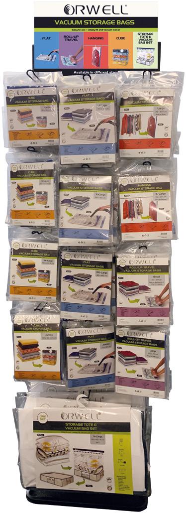 CODE DESCRIPTION Case Quantity No. of Cases 6350 Orwell Flat Vacuum Storage Bag Jumbo 73 x 130cm 1pk 10 5 6351 Orwell Flat Vacuum Storage Bags Large 50 x 70cm 2pk 10 5 6352 Orwell Flat Vacuum Storage Bags X-Large 55 x 90cm 2pk 10 5 6353 Orwell Flat Vacuum Storage Bags XX-Large 80 x 100cm 2pk 10 5 6354 Orwell Roll-Up Travel Vacuum Storage Bags Small 40 x 60cm 2pk 10 5 6355 Orwell Hanging Vacuum Storage Bag Large 70 x 104cm 1pk 10 5 6356 Orwell Hanging Vacuum Storage Bag X-Large 70 x 144cm 1pk 10 5 6357 Orwell Roll-Up Travel Vacuum Storage Bags Large 50 x 70cm 2pk 10 5 6359 Orwell Cube Vacuum Storage Bag X-Large 55 x 70 x 30cm 1pk 10 5 6360 Orwell Cube Vacuum Storage Bag XX-Large 70 x 100 x 35cm 1pk 10 5 6361 Orwell Cube Vacuum Storage Bag Jumbo 90 x 110 x 45cm 1pk 10 5 6358 Orwell Cube Vacuum Storage Bag Large 55 x 60 x 35cm 1pk 10 5 6362 Orwell Storage Tote & Vacuum Bag Set Large 1pk 3 1 6363 Orwell Storage Tote & Vacuum Bag Set X-Large 1pk 2 1 6364 Orwell Storage Tote & Vacuum Bag Set XX-Large 1pk 2 1 CODE DESCRIPTION Case Quantity No. of Cases 6300 Orwell Wondergrip Spring Peg 12pk 12 1 6301 Orwell Value Spring Peg 36pk 12 1 6302 Orwell Heavy Duty Spring Peg 24pk 12 1 6303 Orwell Superior Grip Spring Peg 24pk 12 1 6304 Orwell Euro Grip Spring Peg 20pk 12 1 6305 Orwell Large Spring Peg 48pk 12 1 6306 Orwell Push On Peg 50pk 12 1 6307 Orwell Value Spring Peg and Basket 6 1 6310 Orwell Super Size Wooden Peg 24pk 10 1 6311 Orwell Wooden Peg 36pk 10 1 6312 Orwell Wooden Dolly Peg 24pk 10 1 6314 Orwell Soft Touch Deluxe Euro Peg 10pk 20 1 6315 Orwell Jumbo Soft Touch Deluxe Euro Peg 6pk 20 1 6316 Orwell Easy Grip Superior Firm Hold Peg 12pk 20 1 6317 Orwell Ecolux Peg Caddy with 20 pegs 100% recyclable 12 1 6318 Orwell Daisy Twist Resist Soft Grip Peg 48pk 24 1 6322 Orwell Replacement PVC Rotary Line 60mtr 5 1 6320-25 Orwell Clothes Line Wire Centre PVC Coated 25mtr 5 1 6320-30 Orwell Clothes Line Wire Centre PVC Coated 30mtr 5 1 6320-15 Orwell Clothes Line Wire Centre PVC Coated 15mtr 5 1 6320-20 Orwell Clothes Line Wire Centre PVC Coated 20mtr 5 1 PROVEN TO MAXIMISE SALES STAND SUPPLIED FOC