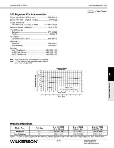 SR2 Regulator Kits & Accessories Bonnet Kit SR2-04-LA00 (Knob) . ..........................SRP-96-018 Bonnet Kit SR2-04-LAS0 (T-Handle)........................CKR11YSS Gauge (Stainless) – 160 PSIG (0 to 1100 kPa), 2" Face.............. K4520N14160SS Mounting Bracket (Stainless).................................... R10Y57-SS Panel Mount Nut – Stainless ............................................................. SRP-96-020 Plastic.......................................................................R10X51-P Pipe Nipple – 1/2" 316 Stainless Steel.......................................SRP-96-010 Service Kit – Relieving ..............................................................SRP-96-011 Non-Relieving.......................................................SRP-96-012 Springs – 0-60 PSIG Range.............................................SPR-388-1-SS 0-125 PSIG Range...........................................SPR-389-1-SS 0-250 PSIG Range...........................................SPR-390-1-SS Note: Order pressure gauge and panel mount nut separately. Note: 1.75" dia. (44.5 mm) hole required for panel mounting (order panel nut separately).