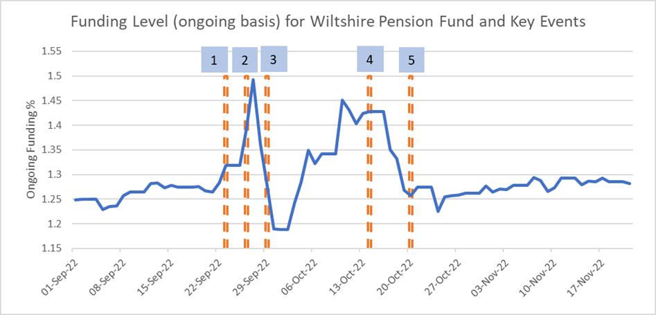 Whilst suffering a decline in asset values the rise in gilt yields has been the dominant factor in the movement in the funding level (i.e. what proportion of discounted future liabilities are covered by the Fund’s assets) This is because the rate used to discount the liabilities to an equivalent value in today’s money is based on gilt yields.