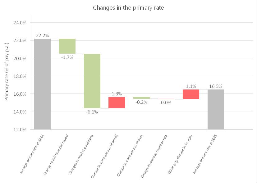 The previous valuation resulted in a whole Fund primary rate of 22.2% of pensionable pay compared to the whole Fund primary rate of 16.5% of pensionable pay at the 2025 valuation. The reasons for the change in the primary rate are set out in the reconciliation chart below.