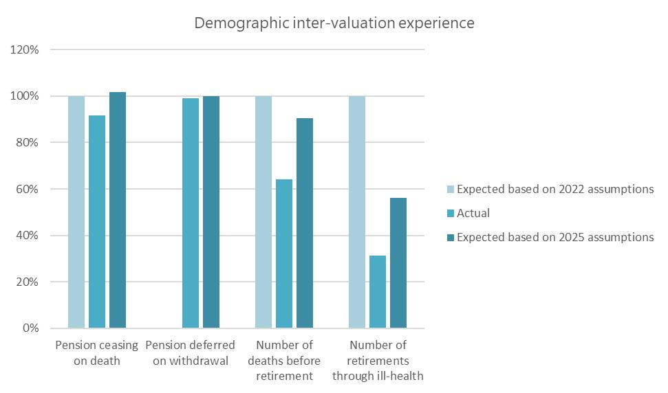 A comparison of the actual demographic experience of members of the Fund over the intervaluation period, with that assumed by the assumptions adopted at the last valuation in 2022 is shown in the graph below. The graph also shows how the assumptions adopted for this valuation would have compared with those adopted at 2022