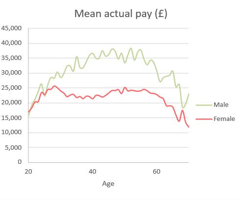 A chart of mean pensionable pay for males and females by age and a chart of mean total pension by age is shown below
