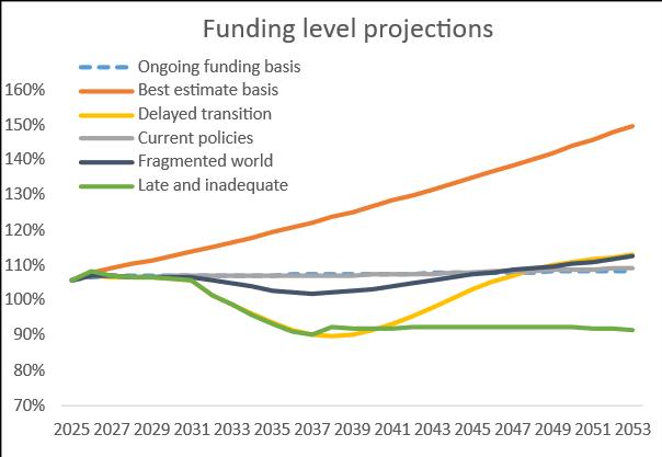 The analysis considered the projected funding level under various climate-related scenarios, alongside the agreed 2025 valuation basis for the Fund. The results thereby allow the administering authority to consider whether the 2025 valuation funding strategy is sufficiently robust in the context of this climate scenario analysis and any potential contribution impacts.