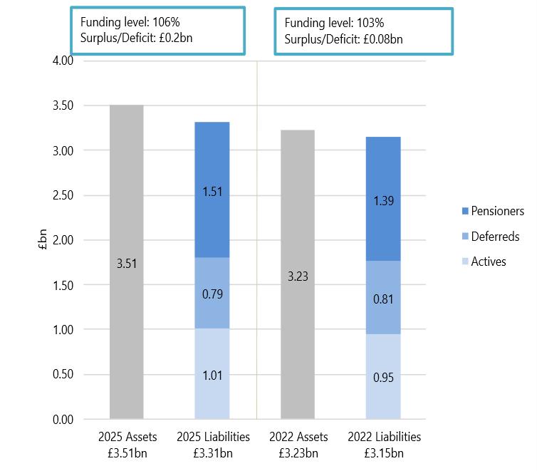 • Using the agreed assumptions, the Fund had a funding position of 106% as at 31 March 2025, which has increased from 103% at the 2022 valuation.