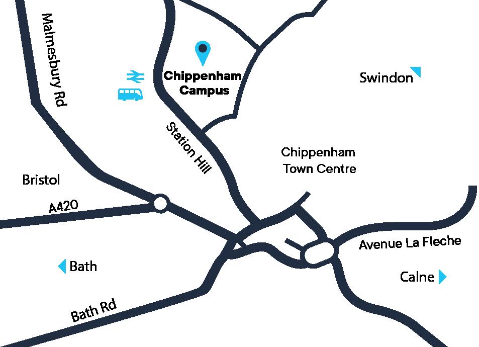 Chippenham station is located directly opposite the campus, just a 2-3 minute walk away. Regular services run to and from Bath, Bristol, Swindon and Reading.