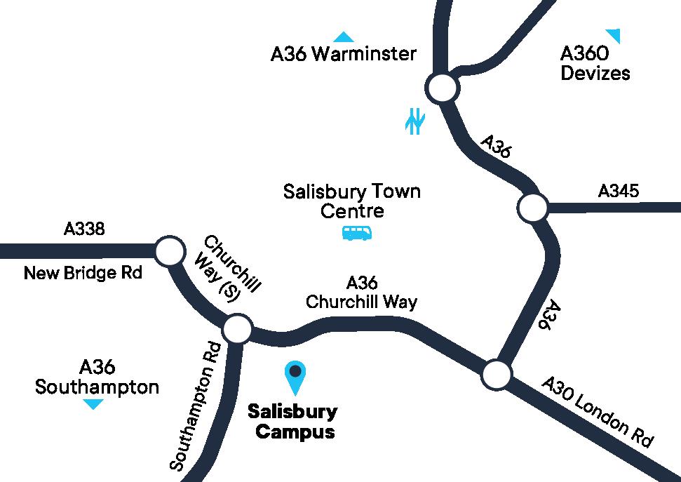 Salisbury has frequent bus routes from across Wiltshire, Hampshire, and Dorset. Most services stop at Salisbury city centre, which is within walking distance of the campus.