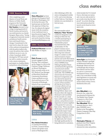 Katharine “Kate” Bartlett ’07 worked on the COPPER nanosatellite, selected by NASA to be launched into orbit. Moira Egler was featured in Atlantic Monthly’s spotlight on Millennials making it in Pittsburgh. Moira returned to Pittsburgh after living in New Orleans and has taken on a job as a community development liaison, working with a city councilman to help draft legislation on vacant and blighted properties. Find the article online at http://www. theatlanticcities.com.