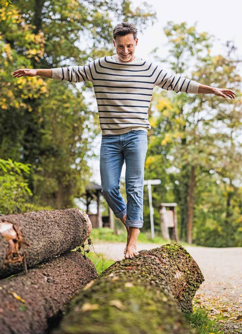 Le sens de l’équilibre nous accompagne tout au long de la journée. Aucun mouvement ne se fait sans lui. Toute une série d’organes sensoriels, entre autres, y participent et interagissent : les yeux, les oreilles, la peau, les muscles, les articulations, les tendons, ainsi que le système nerveux central et le cerveau. Les mouvements s’effectuent dans les dimensions haut et bas, avant et arrière, gauche et droite. Trois systèmes corporels différents interviennent dans la coordination des mouvements. Le système optique, d’abord, qui fournit des informations sur l’environnement et la position dans l’espace par l’intermédiaire des yeux. Le système vestibulaire, ensuite, situé dans l’organe de l’équilibre proprement dit, c’estàdire dans l’oreille interne, qui détermine la direction de la gravité et de l’accélération. La proprioception, enfin, ou la perception de son propre corps, constituée de sensations extérieures situées à la surface du corps et de stimuli provenant de l’intérieur du corps. Les informations provenant de ces trois systèmes sont traitées dans le cerveau et transmises à d’autres organes. Sur la base de ces infor mations, les yeux, les muscles et les articulations stabilisent la position du corps et permettent l’orientation dans l’espace. Si les informations sont contradictoires, cela peut entraîner des vertiges, des malaises, voire des nausées. Cela se produit par exemple lors de voyages en mer, lorsque l’organe de l’équilibre signale une position inclinée, mais pas les yeux, car ils se concentrent sur un point fixe à l’intérieur du bateau. Autres facteurs susceptibles d’altérer l’équilibre : des infections ou des lésions de l’oreille interne, ou encore le vieillissement. Heureusement, un entraînement ciblé peut y remédier.