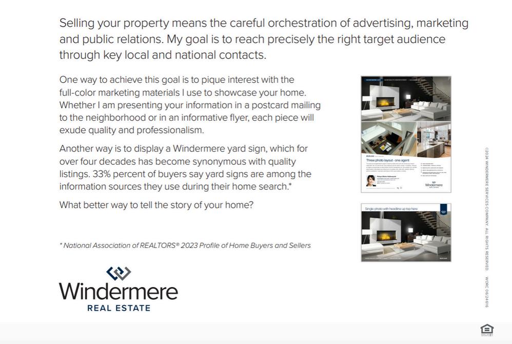 I have access to a number of print and digital advertising opportunities including Windermere Living, Lifestyle Northwest & Puget Sound Business Journal. Windermere’s Luxury Breakfasts offer additional exposure for listings in our Premier Program and our W Collection. Through our Luxury Portfolio partnership, I have global print marketing opportunities with publications like Architectural Digest and Luxe Interior + Design.
