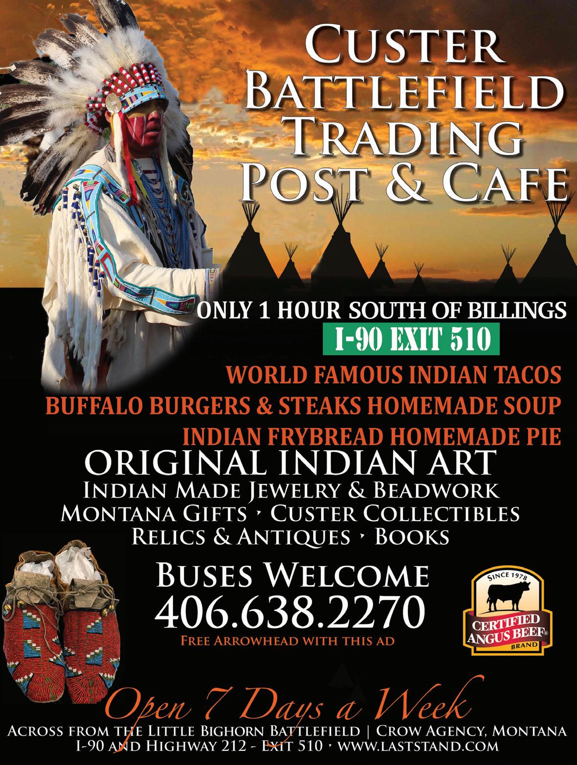 The Custer Battlefield Trading Post & Café is across from the Little Bighorn Battlefield. Enjoy world-famous Indian tacos or try a delicious buffalo burger or steak. Featuring American Indian jewelry, souvenirs, collectibles and art. Buses welcome!