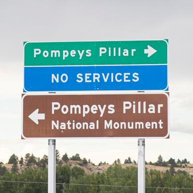 WILD & WACKY: POMPEYS PILLAR Which way do we go? While technically correct, this sign makes us laugh. Turn left for Pompeys Pillar National Monument, where Captain William Clark of the Lewis & Clark Expedition carved his name in the rock pillar in 1806. If you go right, you will drive through the unincorporated rail community with the same name.