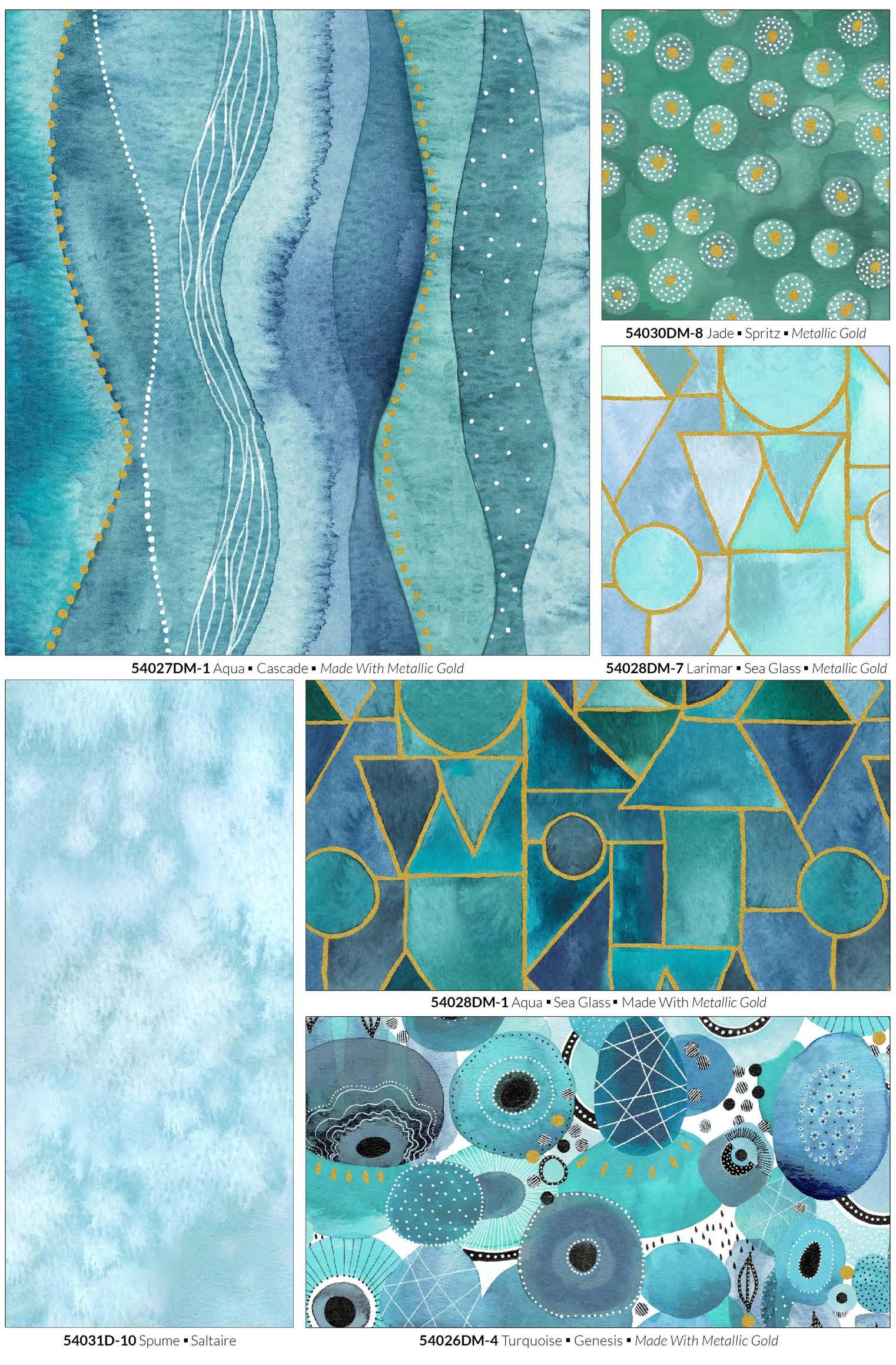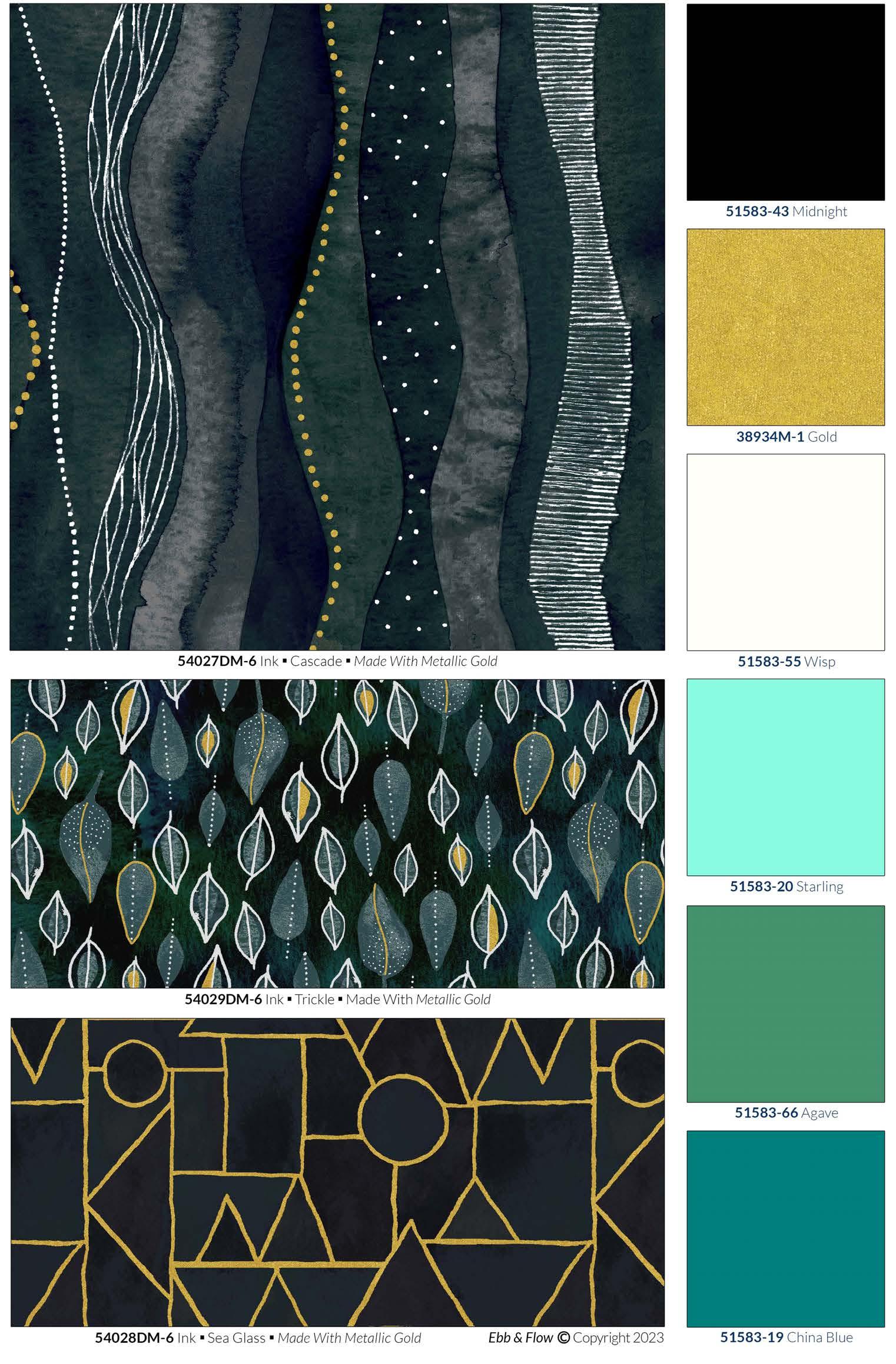 Kate loves using metallic gold in her paintings. Knowing this, Windham Fabrics incorporated this theme into Ebb & Flow. The team brought Kate’s fabric to life by adding metallic embellishments to match her artwork. The metallic is soft and never overpowering. It adds just the right bit of shine & dimension to the prints, and especially, your projects.
