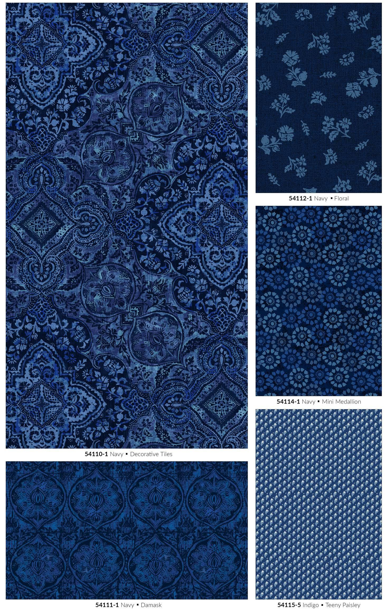 Banyan brings a touch of sophistication to your home décor. In a classic color palette of indigo, denim, chambray and linen, the ornate tile designs, damasks, delicate paisleys and mini medallions exude timeless elegance. Whether you’re creating a quilt, quilted coat, pillow covers or a gorgeous table setting, the collection will transform your space into a sanctuary of refined beauty.