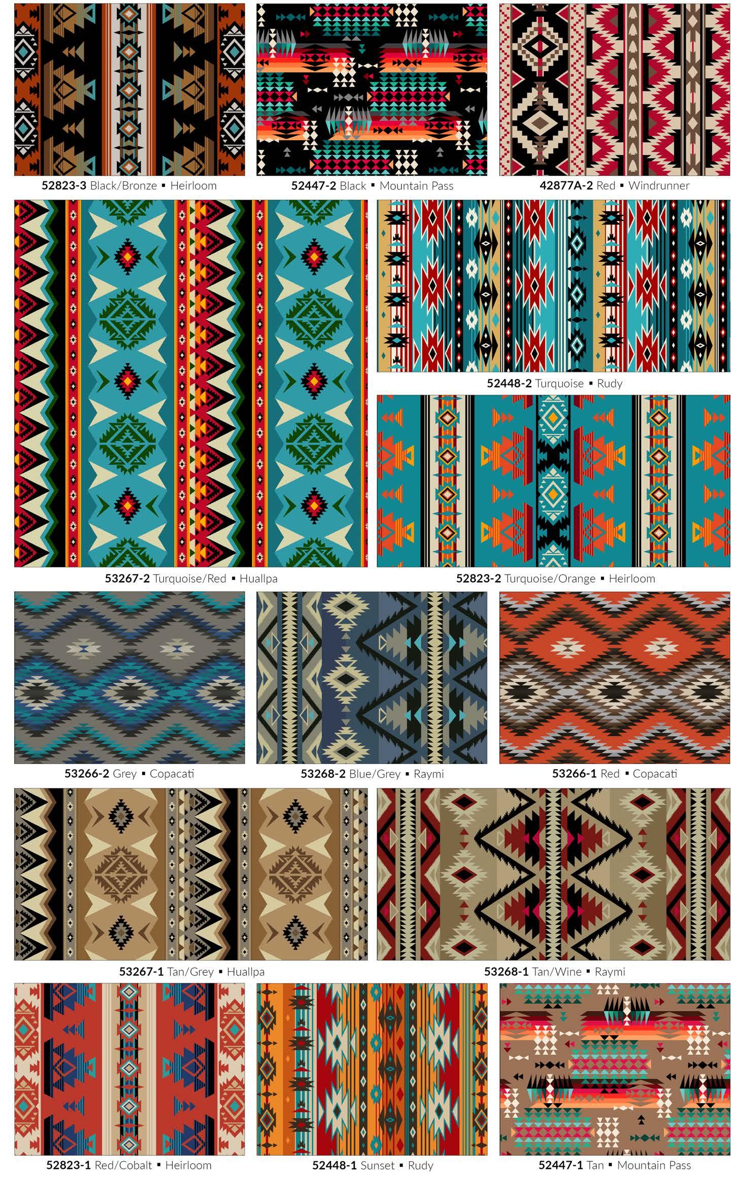 Spirit Trail includes an assortment of decorative stripes and motifs inspired by traditional southwest designs in rich colors of earth, stone, onyx, turquoise and red clay. Fabrics available in various substrates and designs including: Cotton, Canvas, Flannel, and WinterFleece.