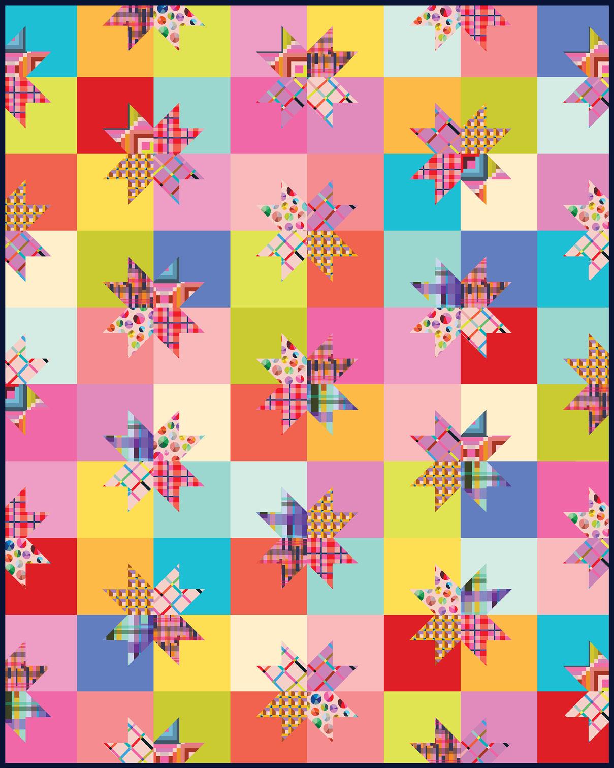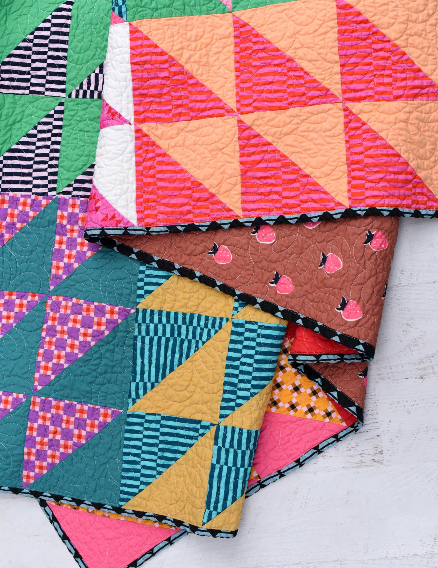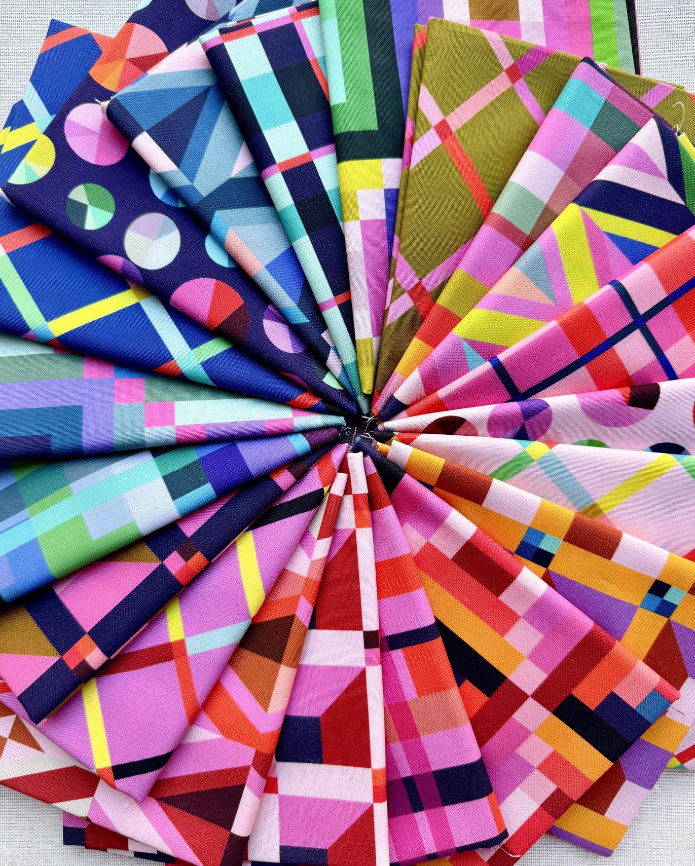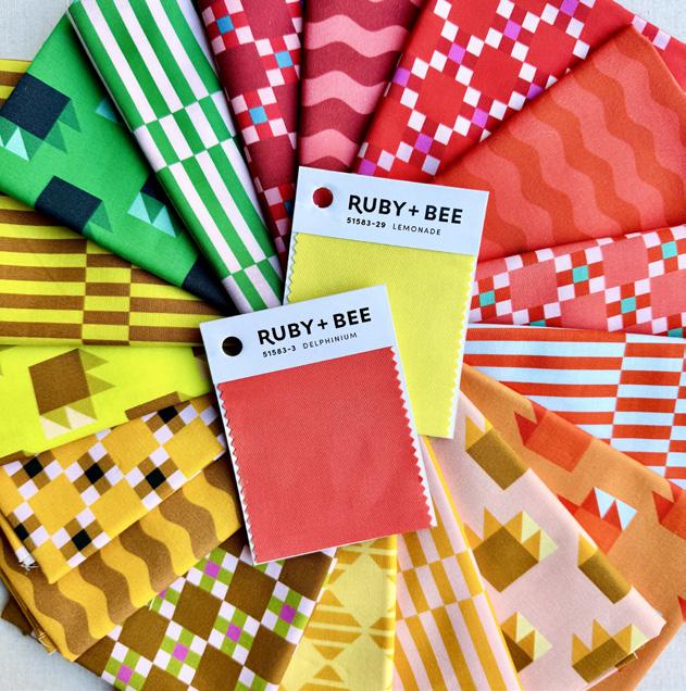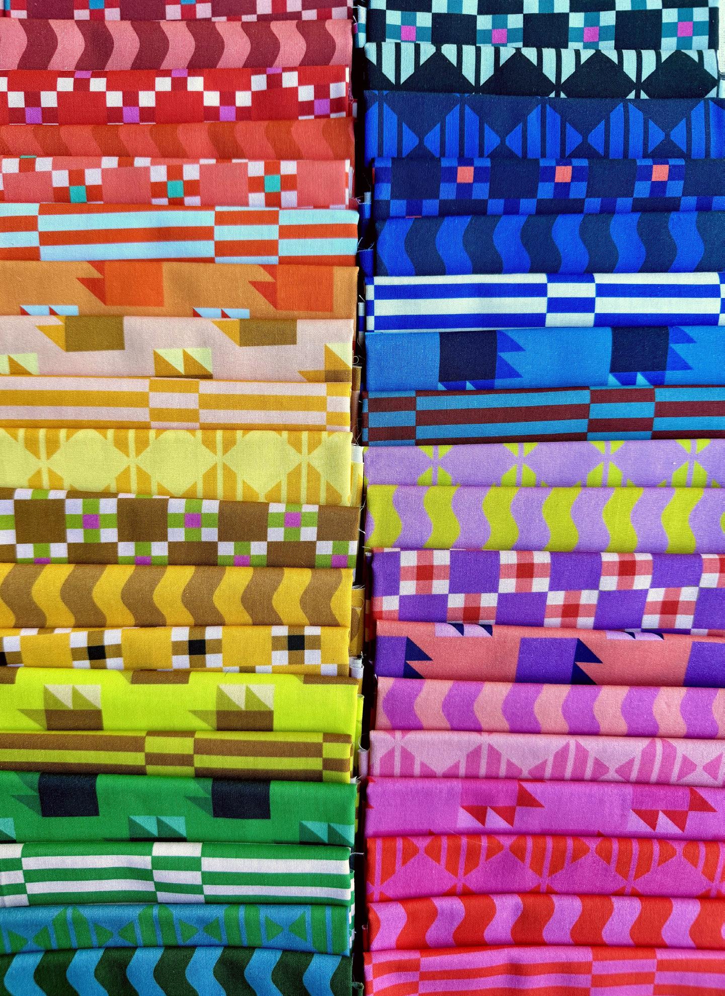 Annabel’s Blenders celebrate the joyful movement of color and shape. Bold wavy stripes, sweet checkered blocks and nostalgic Bear paw motifs echo the language of traditional textiles but with a crisp, modern twist. Warm reds, playful pinks, citrus brights and cool blues create a dynamic spectrum that’s easy to mix and full of energy. Designed for makers who love graphic prints, this collection turns simple forms into vibrant, rhythmic pattern play. Perfect for use in quilts, apparel and home decor projects and to blend beautifully with Ruby and Bee solids. ~ Annabel Wrigley