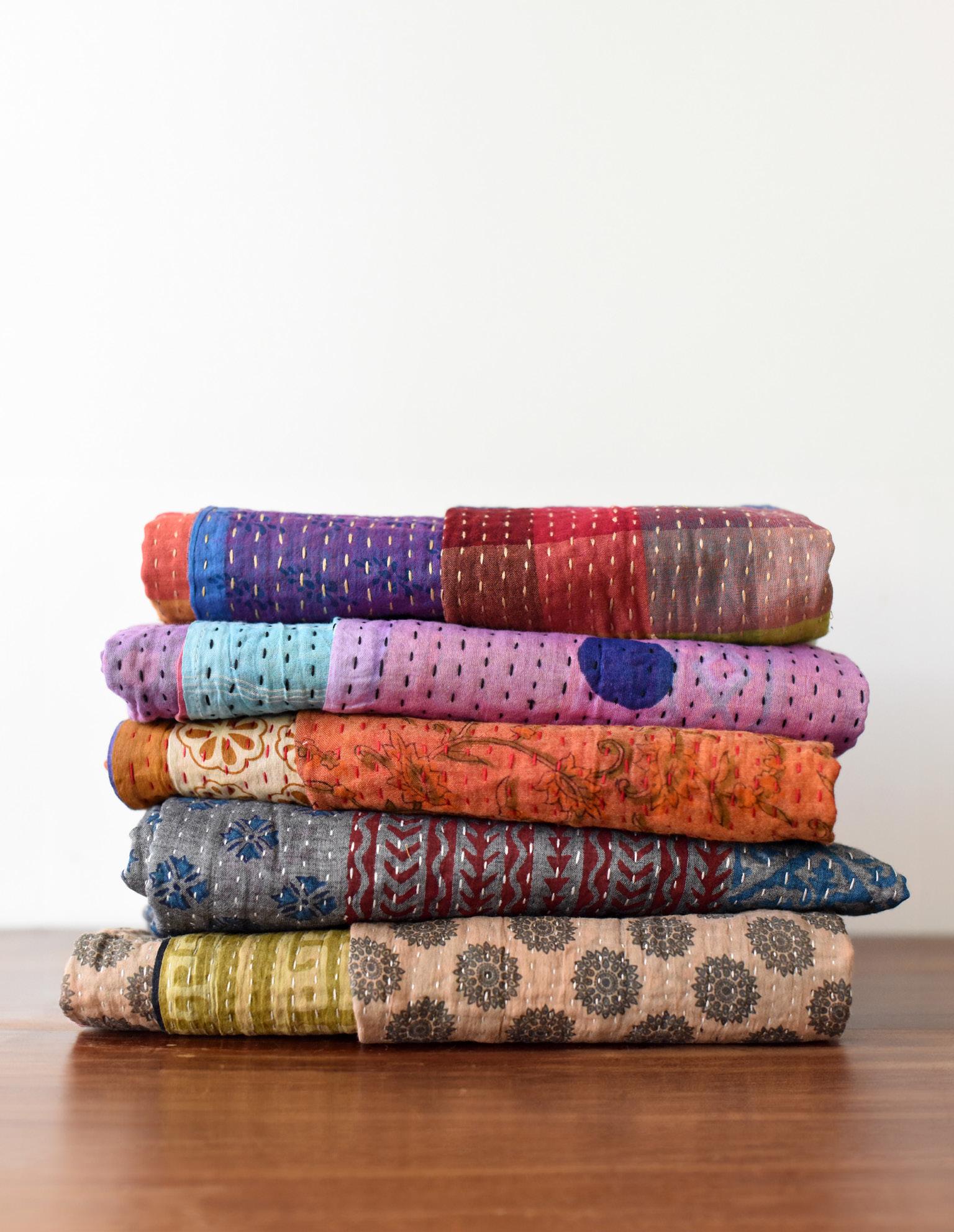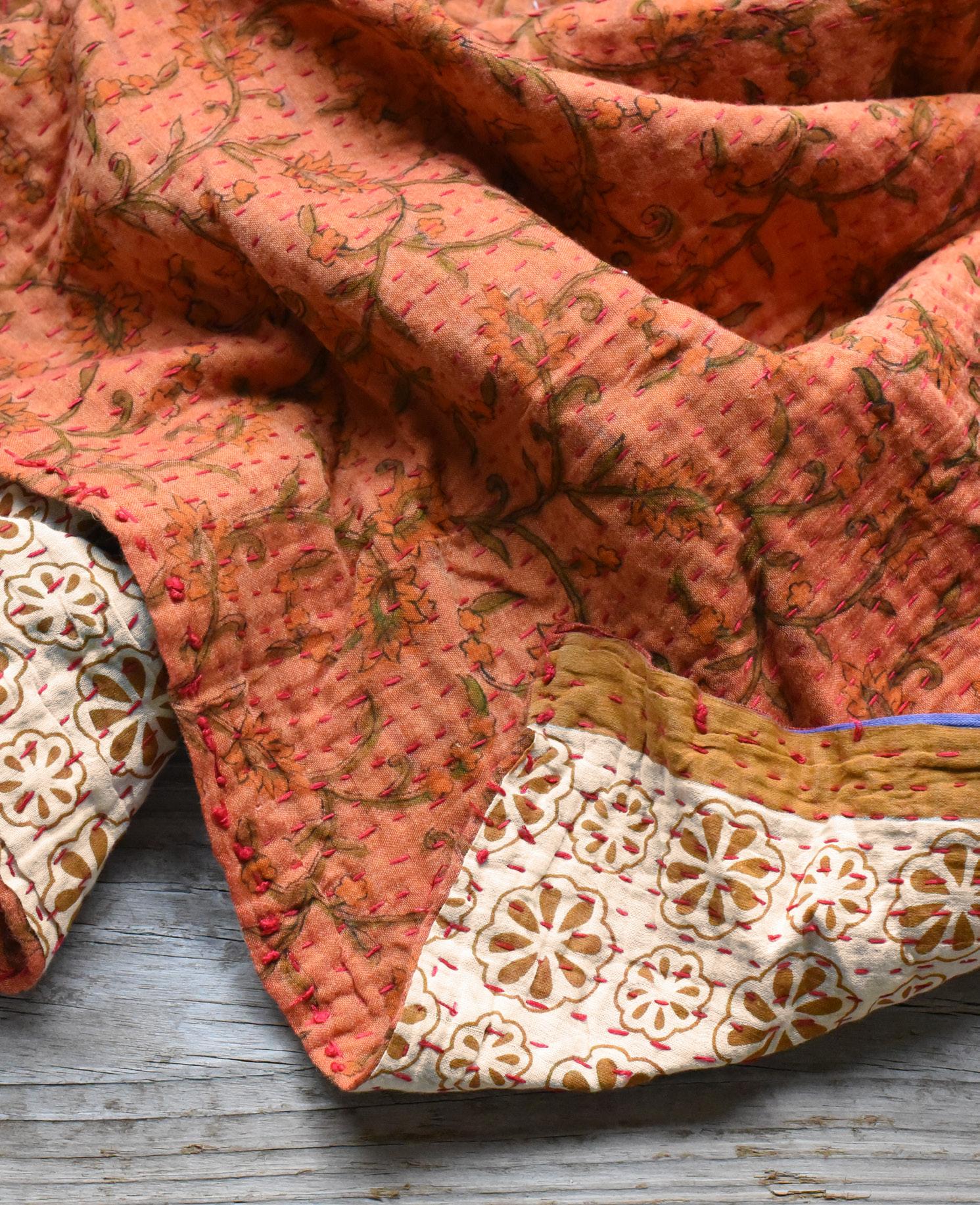 Each piece of Kantha carries the unique touch of the artisan who made it. The subtle imperfections in the running stitch are part of its charm--celebrating the beauty of this traditional, hand-stitched craftsmanship. Kantha features three layers and a double-sided design for added versatility.