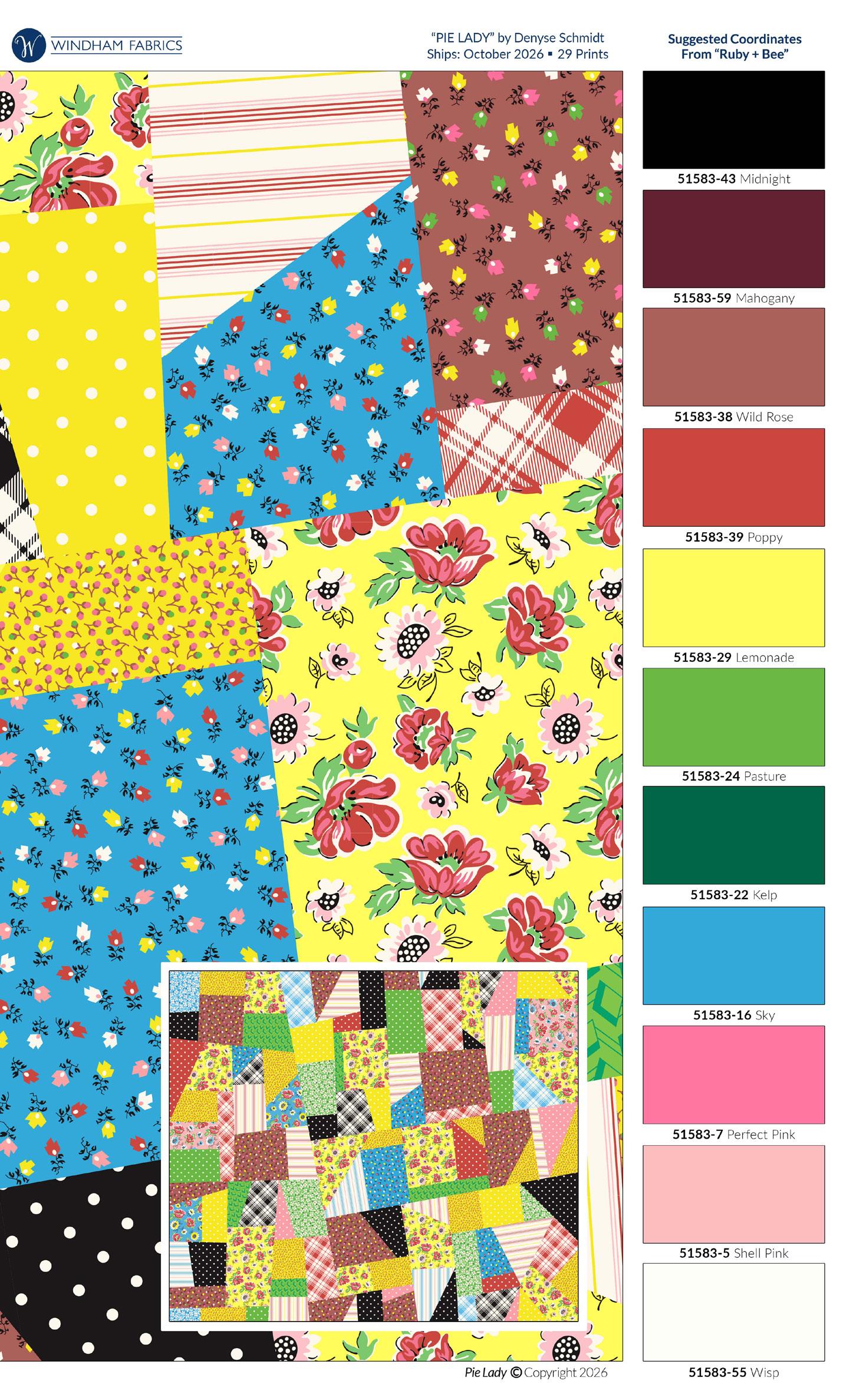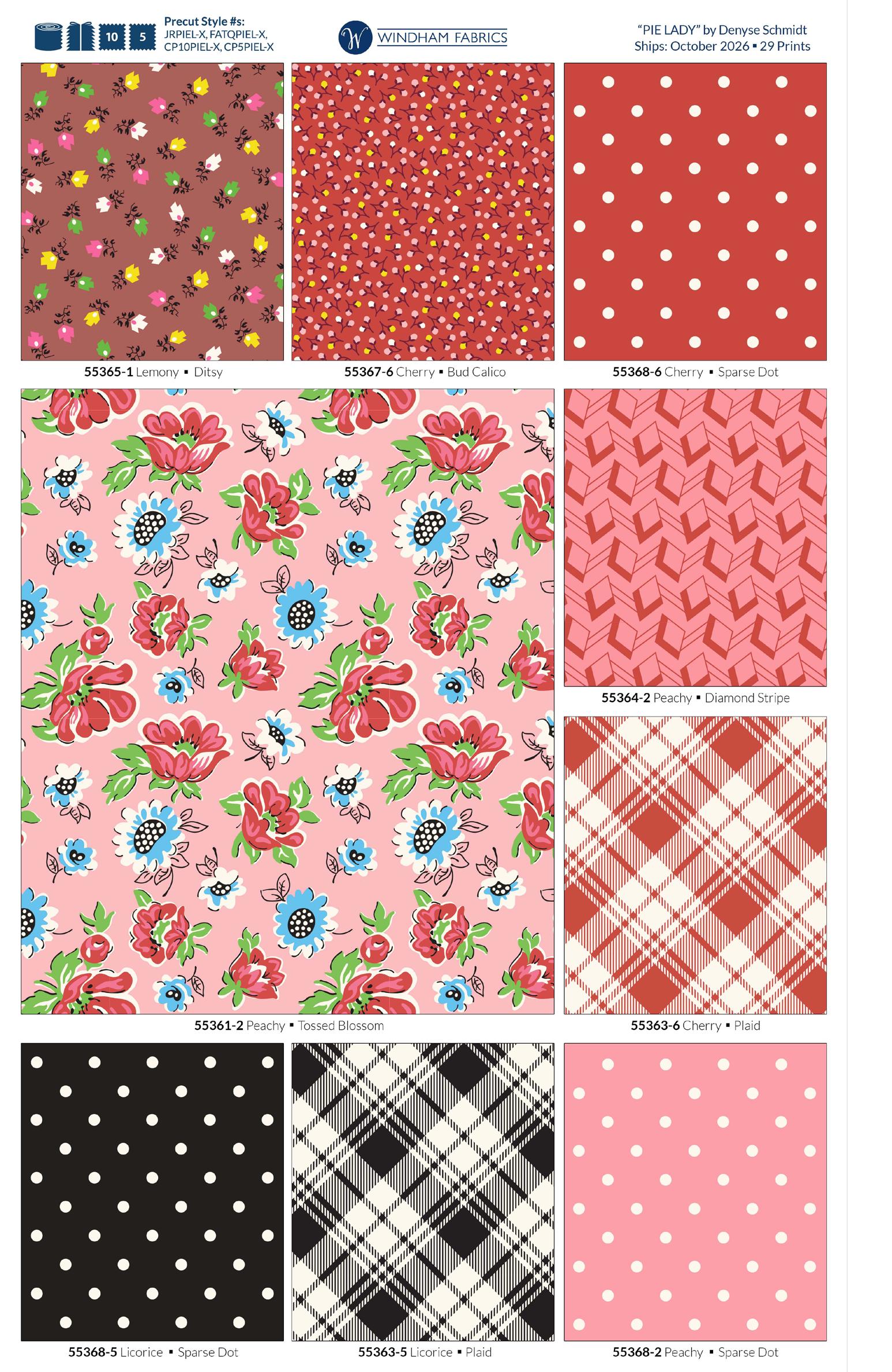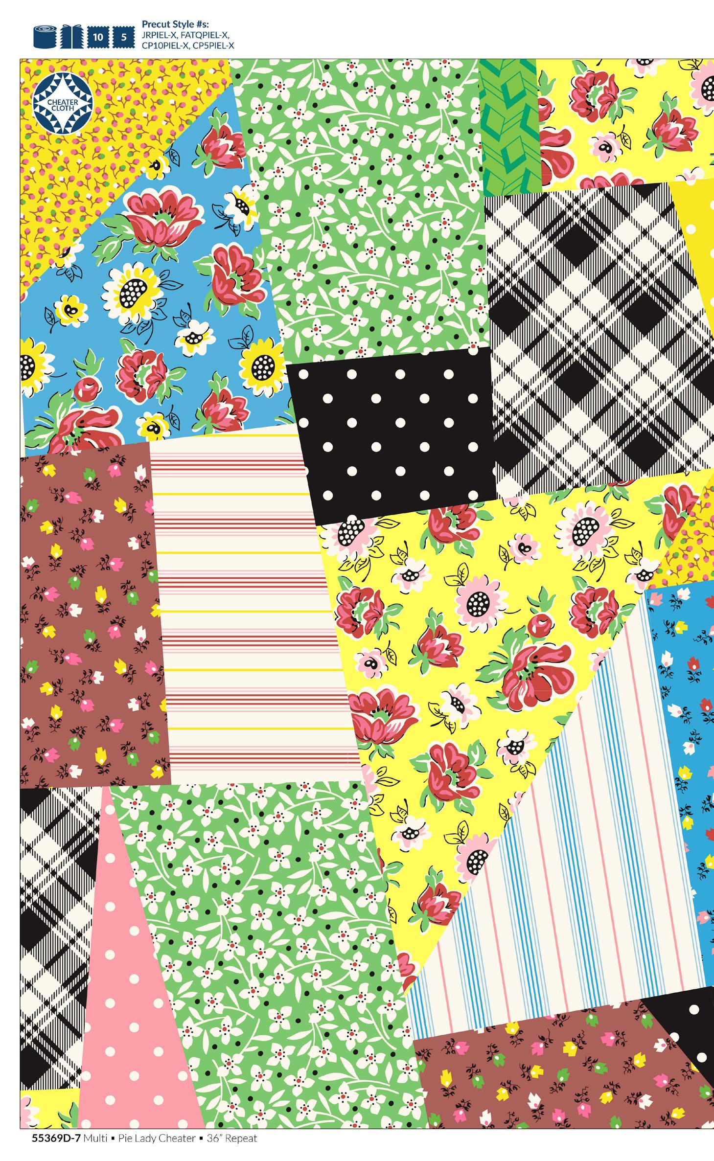 Pie Lady celebrates Americana with prints that call to mind a well-loved kitchen, the gingham tablecloth dusted with flour as dough is rolled for pies to celebrate the bounty of the harvest (and maybe garner a prize ribbon)! Sweet floral curtains frame the view of the garden, sunlight streaming in on jars of freshly canned fruits and vegetables topped with calico-wrapped lids. An apple pie cooling on a vintage rack fills the room with a mouth-watering aroma. Home-made quilted potholders, mom’s old red-handled rolling pin, and a crazy-patchwork cheater print apron complete a nostalgic polaroid snapshot capturing the joy and love of home, celebrating with family and friends.