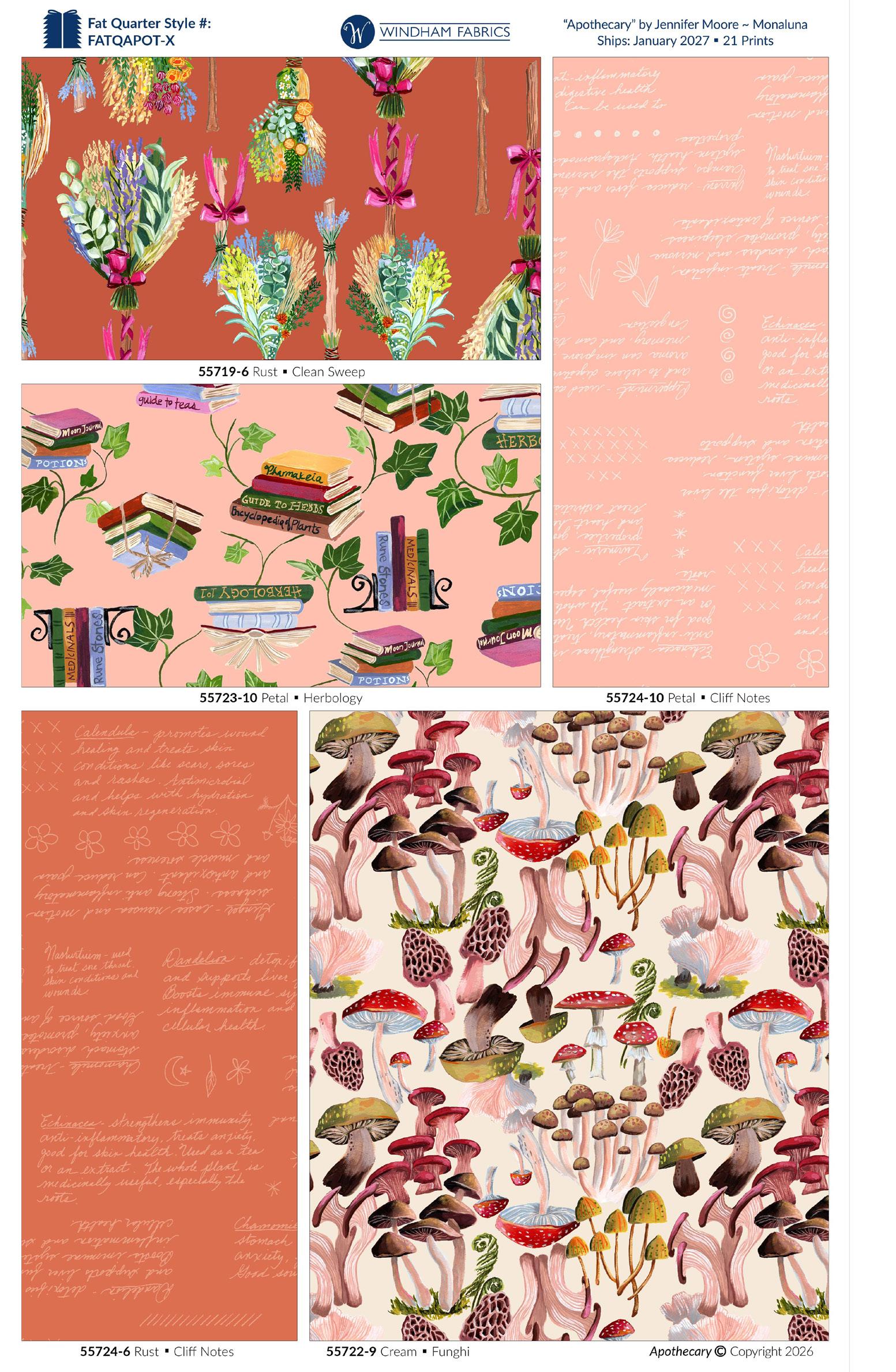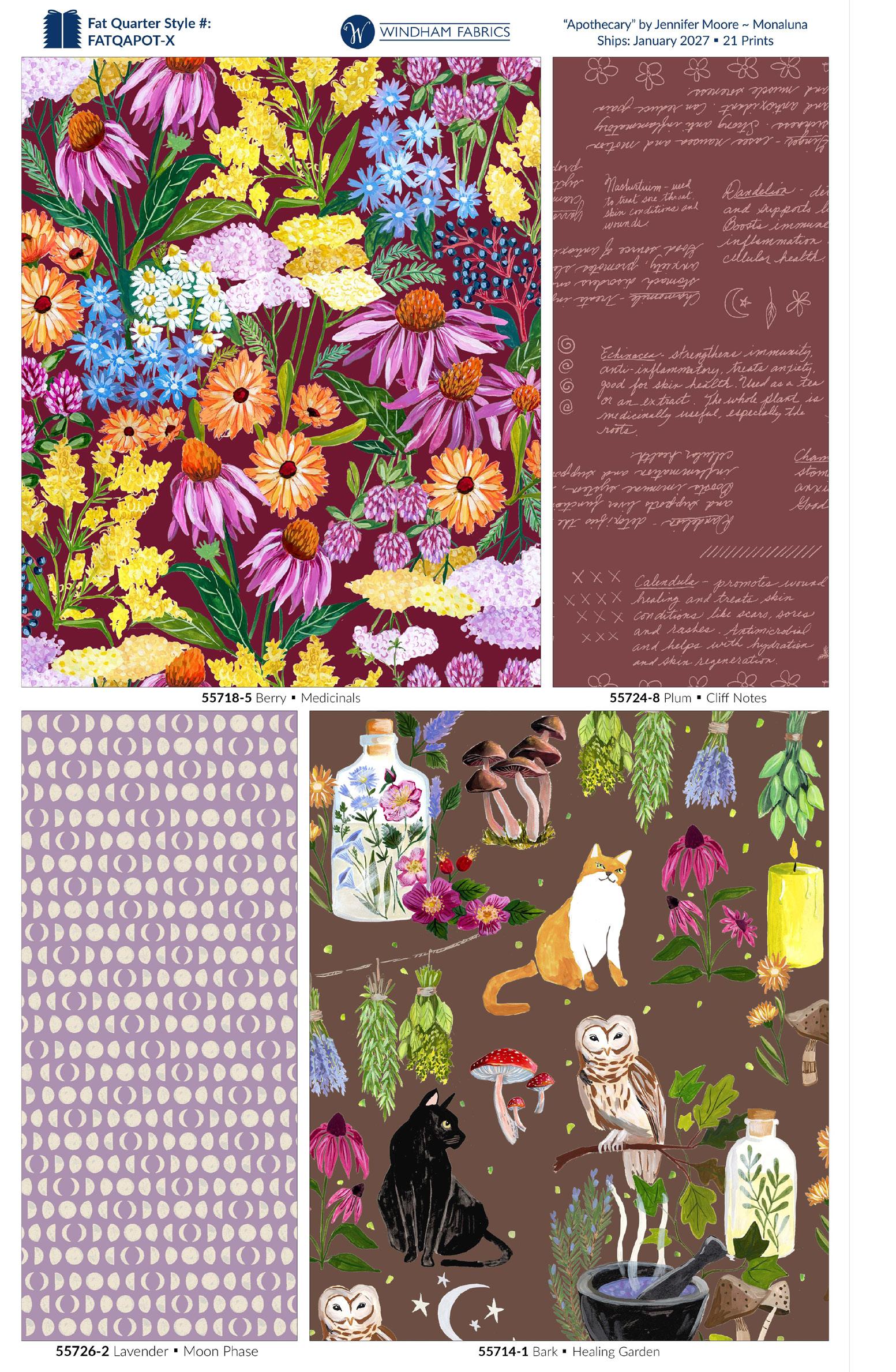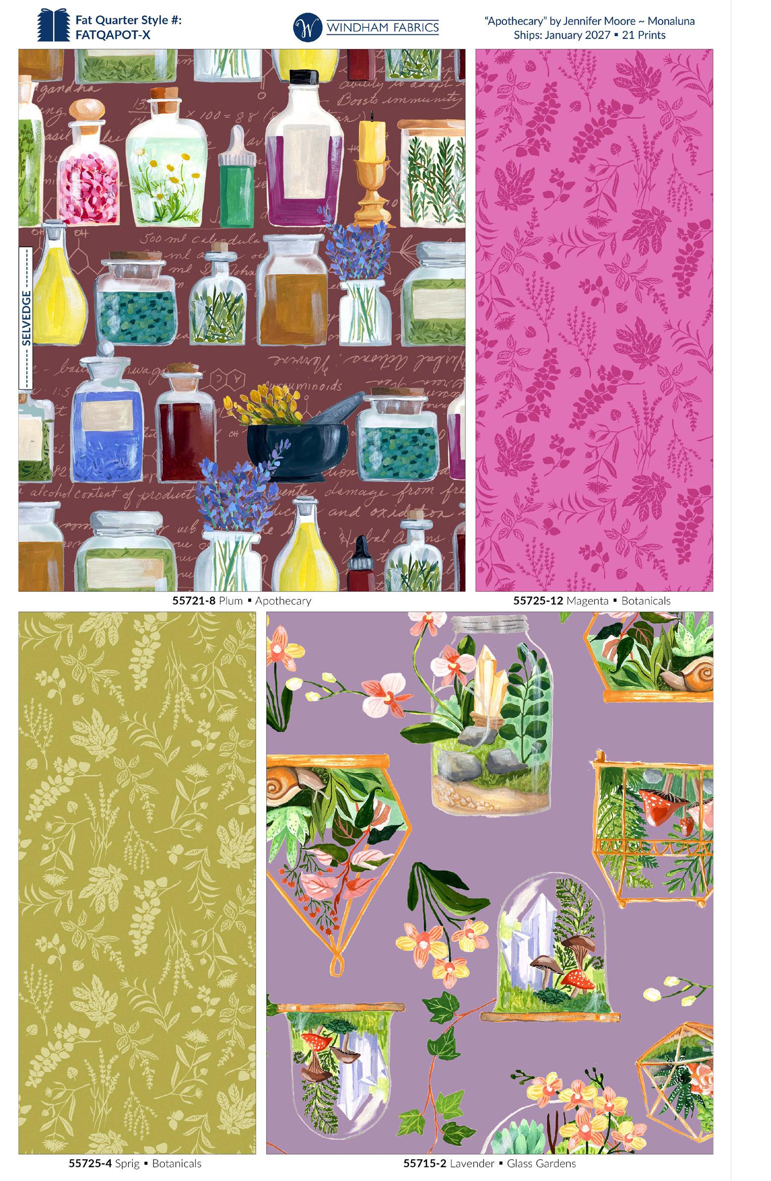 The Apothecary collection celebrates the healing power of plants and the natural world. Recently, I’ve been learning more about the medicinal properties of the plants in my own garden, as well as those growing in the wilder areas near me, and it has given me an even deeper appreciation for our environment, and for the ways that plants can heal, nourish and improve our lives. These themes have made their way into my daily sketches, and now into a collection of fabrics that I hope will inspire you as well! ~ Jennifer