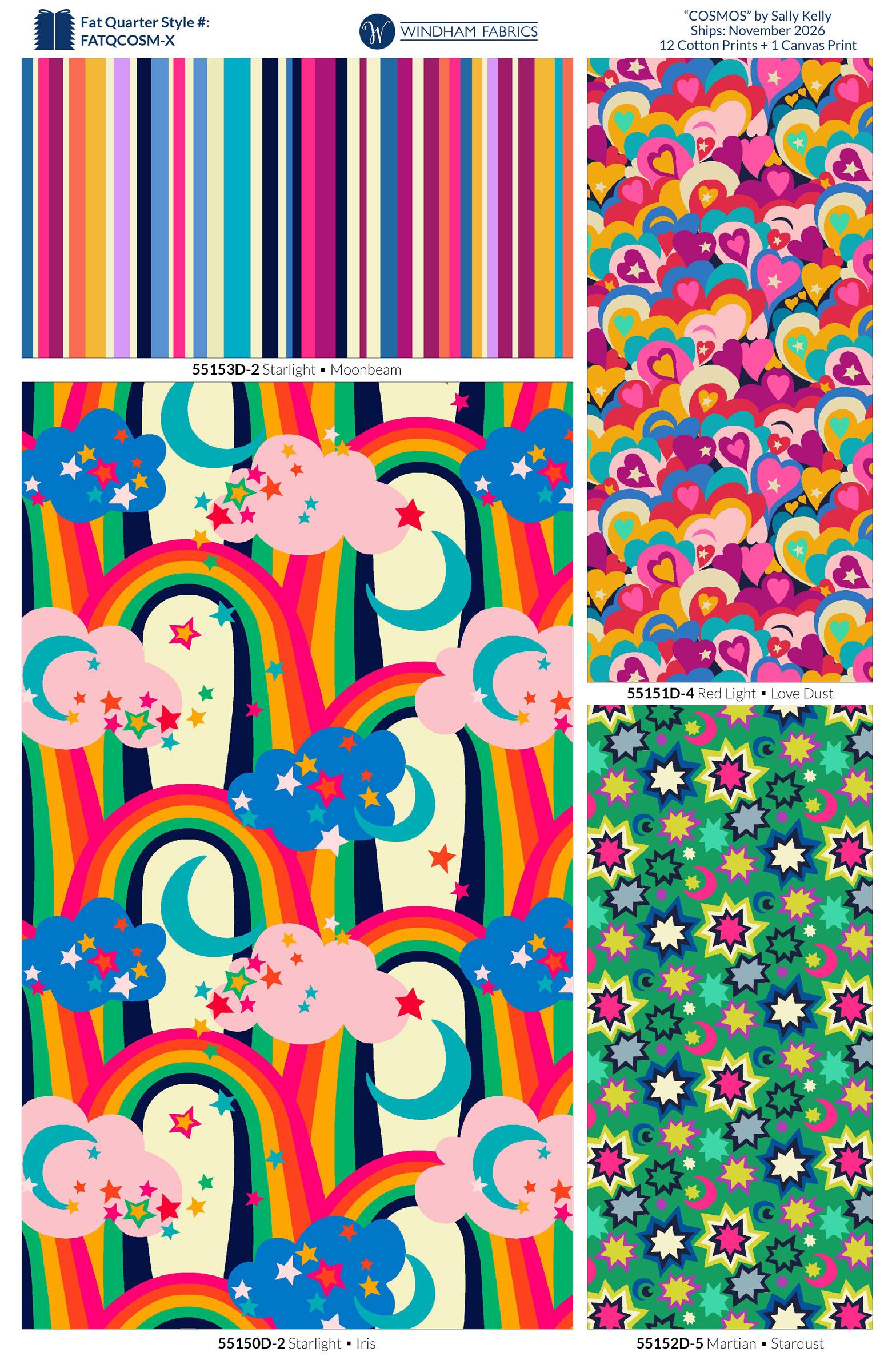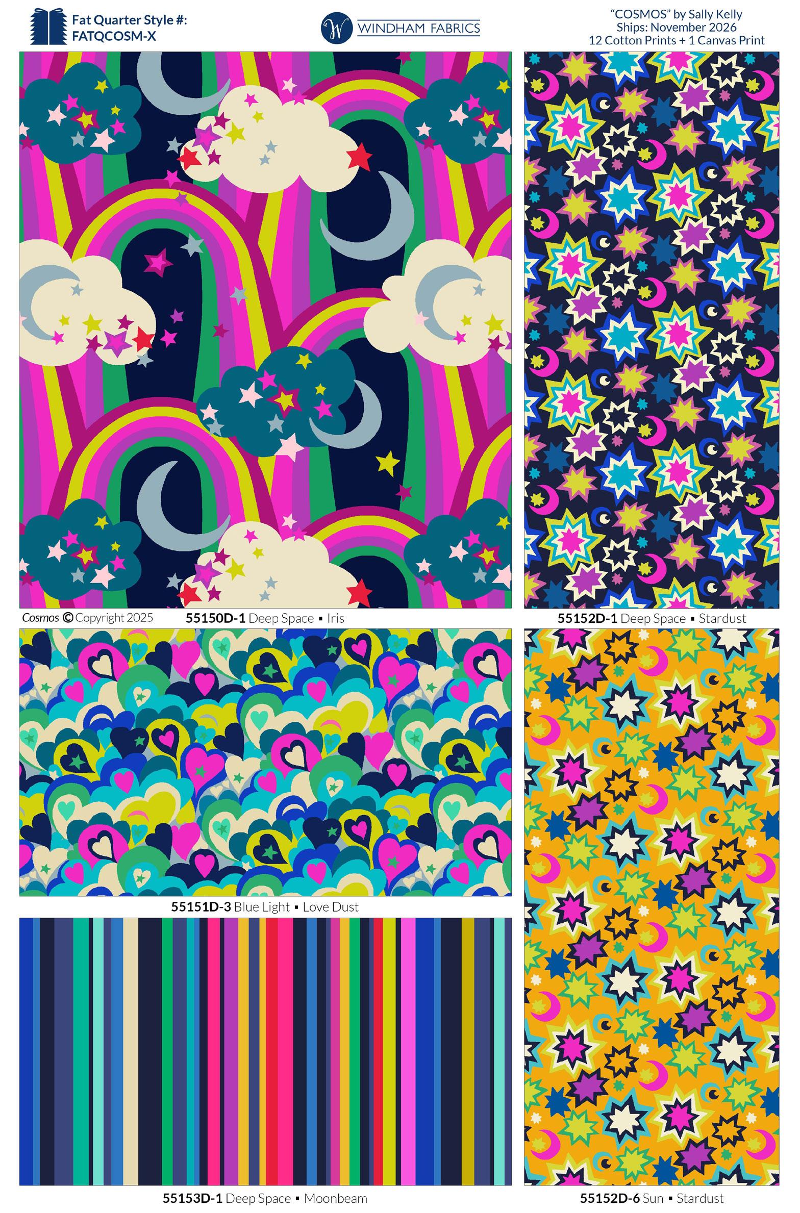 At the heart of the collection are two dramatic hero prints: Galaxy and Cosmos. Each tells its own story of the night sky. Complementing these are a striking Moonbeam Stripe — perfect for piping, trimming, or as a bold standalone statement — and two smaller designs, Starlight and Hearts, featuring scattered stars and delicate hearts for a playful touch.