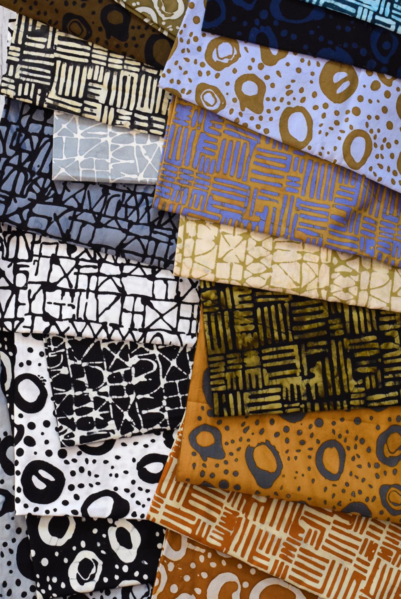 Always eager to expand my art supply collection, I explored grinding earth pigments, mixing with binders and filling tiny seashells, acorn caps and half pans with quiet colors. Studio tables slowly filled with little experiments. Later, when I pulled the fabrics for a new batik collection, the choices reflected the colors surrounding me, muted and moody. Editing was difficult and the reject pile was as eye-catching as the first pull, it begged to be used as its own separate collection. Meet my salon de refuses collection in Moody Mod Part 1, part 2 to come! My Overflow specialty batiks are what they sound like, the result of an excess of many great coordinating options to compliment Moody Mod Part 1. Discover some of the possible color combinations in this little group of lines. ~ Marcia